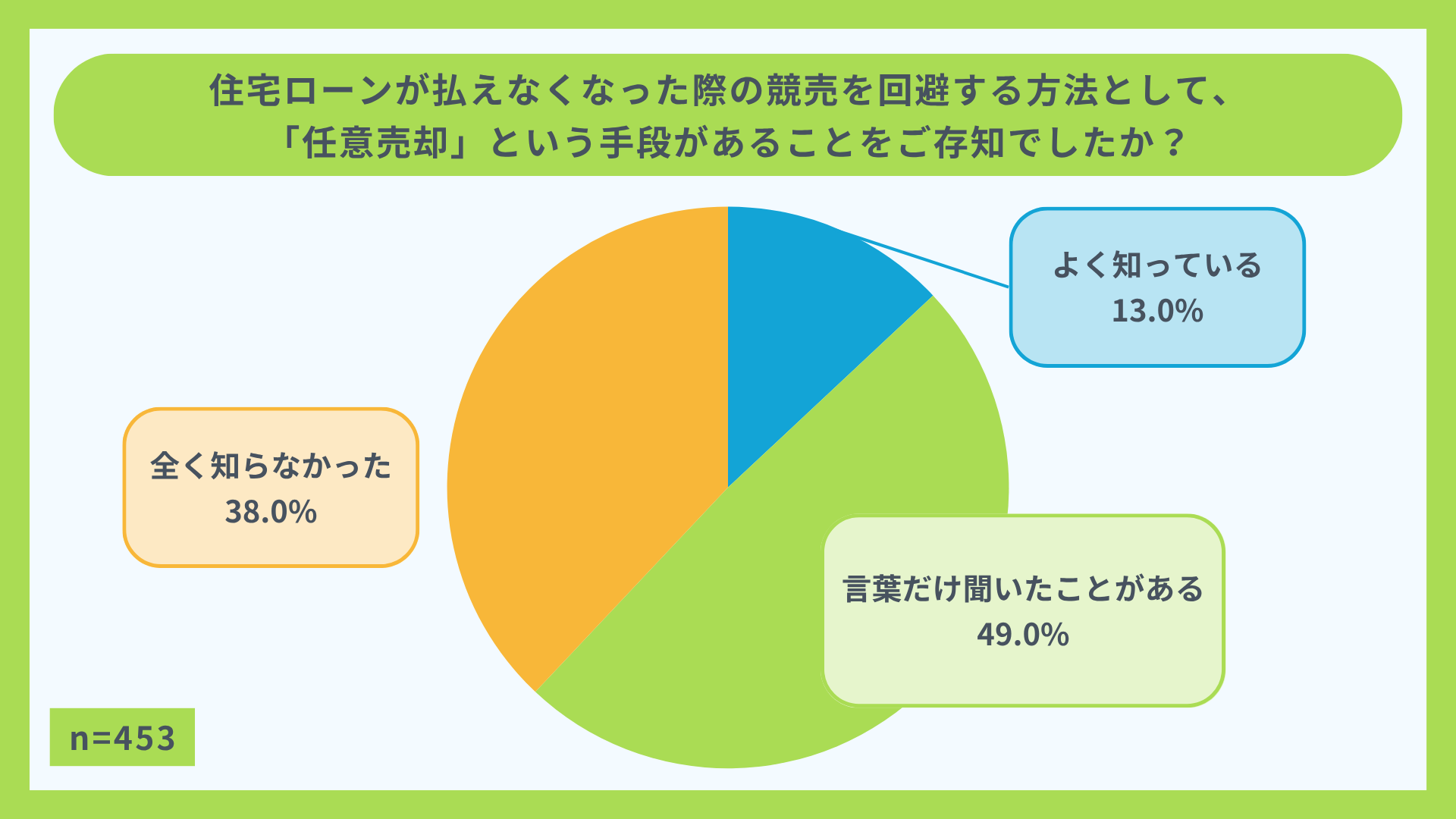 Q. 住宅ローンが払えなくなった際の競売を回避する方法として、「任意売却」という手段があることをご存知でしたか?(n=453)