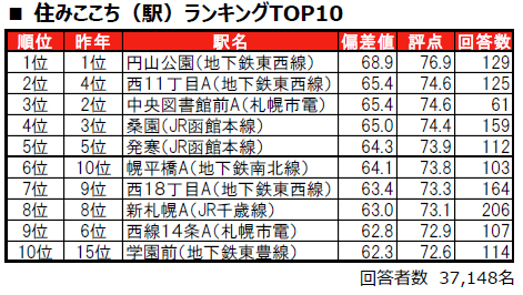 札幌市中央区に位置する円山公園(地下鉄東西線)が、6年連続で1位に輝きました。2位は昨年4位から順位を上げた西11丁目A(中央区役所前・西11丁目・西8丁目を統合)、3位は中央図書館前A(石山通・中央図書館前・電車事業所前・ロープウェイ入口を統合)です。トップ10内では、6位の幌平橋A(昨年10位)、10位の札幌市豊平区に位置する学園前(昨年15位)が昨年から特に順位を上げています。