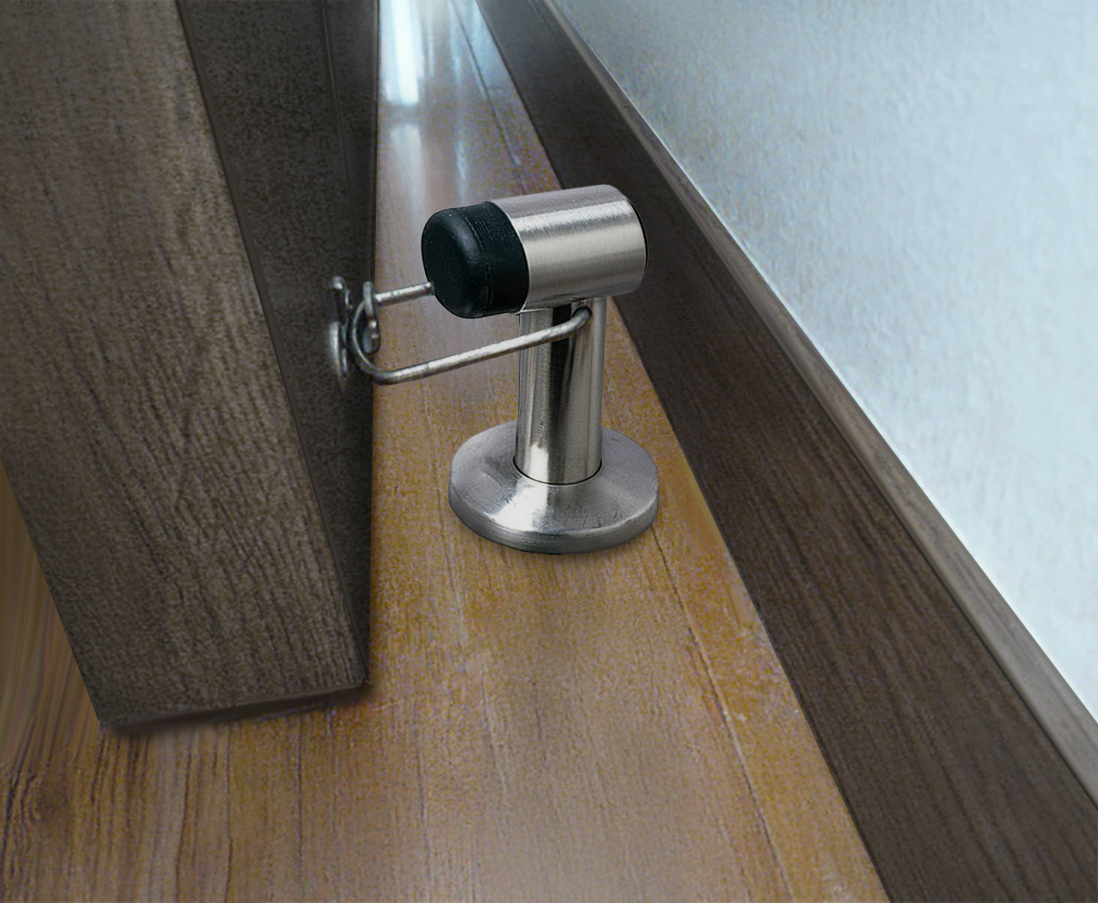 ドアに取り付けたマグネット金物により、ドアが近づくと磁力で床側のフラップが持ち上がってドアを止める構造。かがんでフックをかける動作をしなくても開いた状態でドアを固定できる。床側の部品は従来品と比べて突起物が完全になくなり見た目もすっきりしたが、逆にドア表面の金物がやや目立つ。