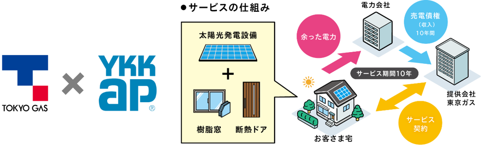 東京ガスが提供する太陽光発電設備とYKK APが提供する高断熱な「APW」樹脂窓シリーズと断熱玄関ドア、エクステリアまたはインテリア(*5)商材をセットで導入し、太陽光発電設備の余剰電力の売電債権を東京ガスが保有することで、お得な費用でご利用いただけるサービスです(一部容量帯においては太陽光サービスを0円で導入可能(*6))。10年間のサービス期間終了後は、売電収入も見込めます。