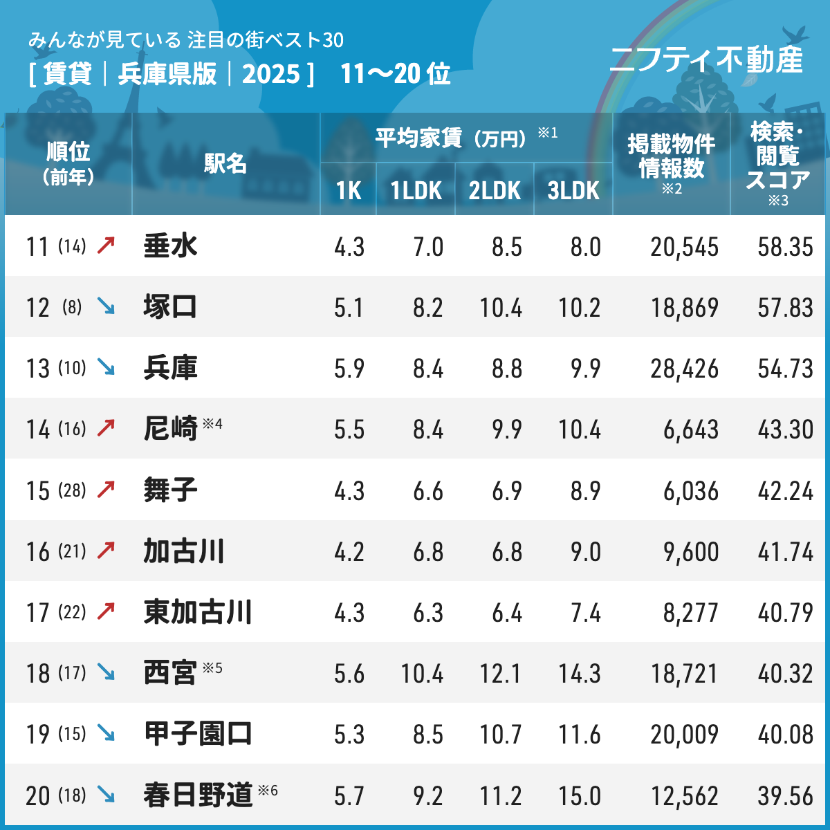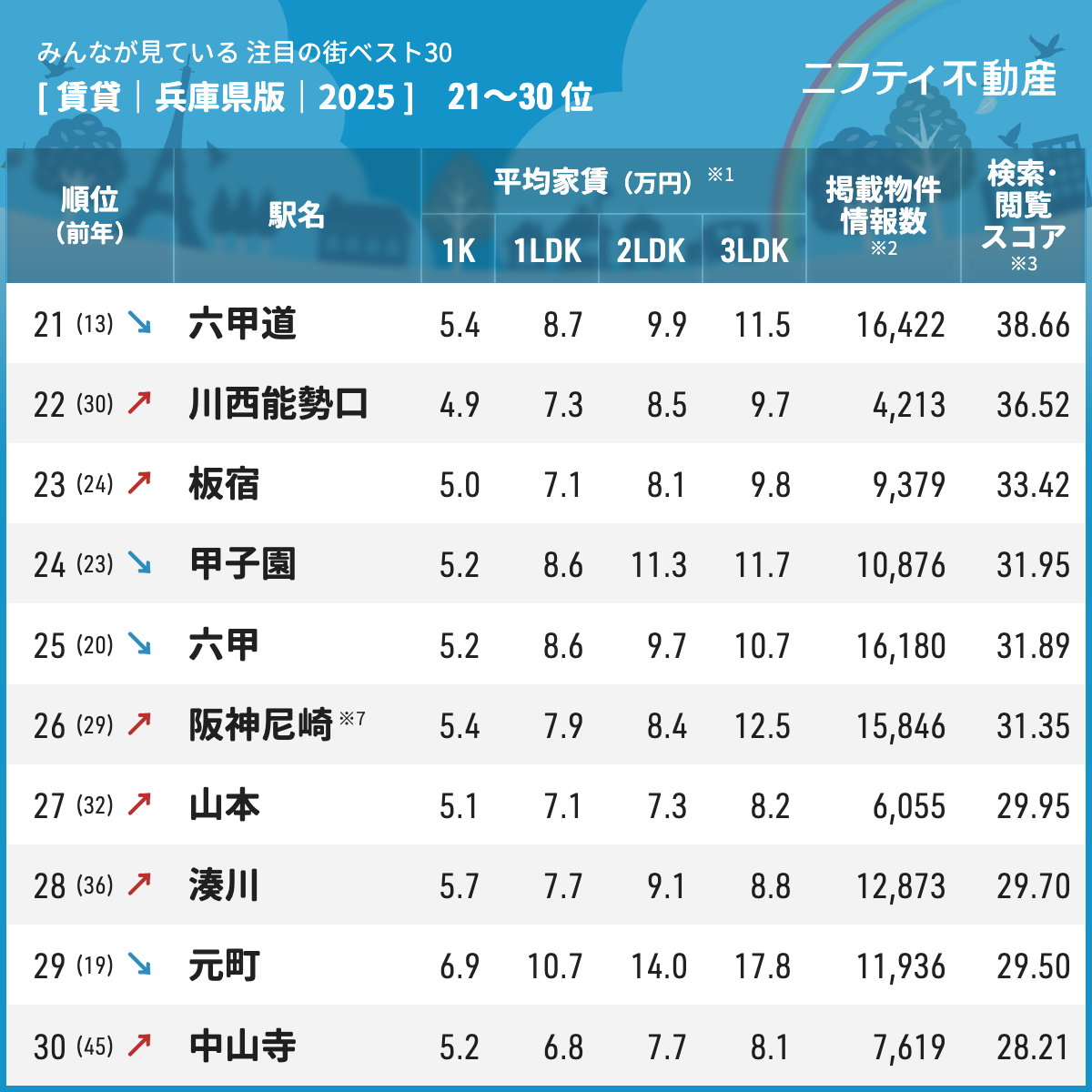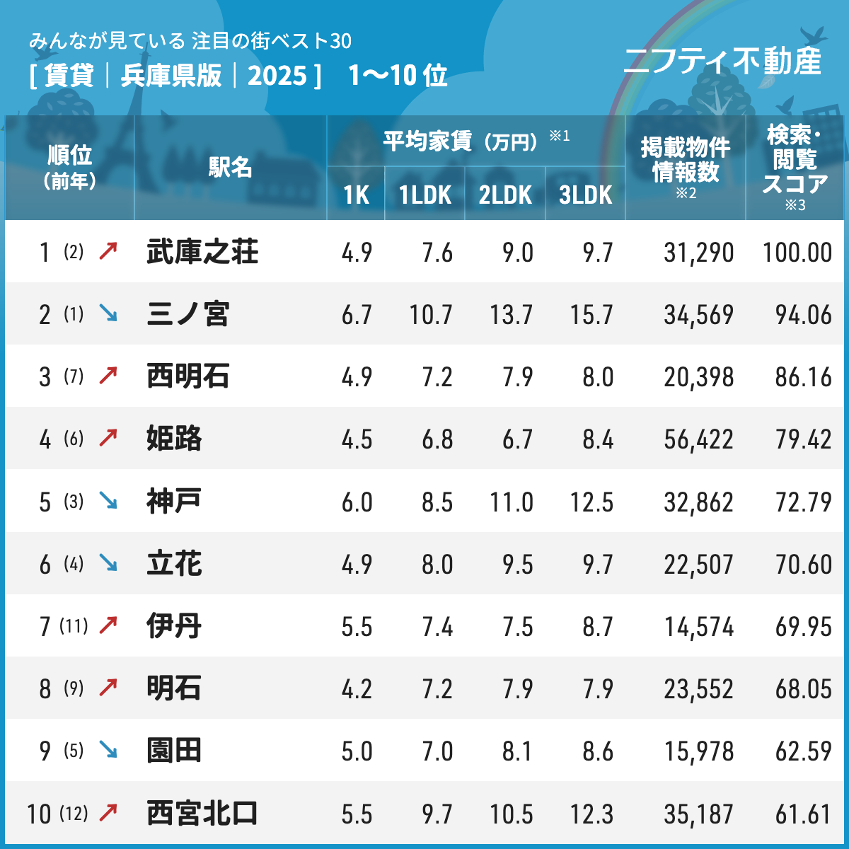 今回は、関西エリアから兵庫県で賃貸物件を探しているユーザーからの注目を集めた街ランキングベスト30(2025年)を発表いたします。