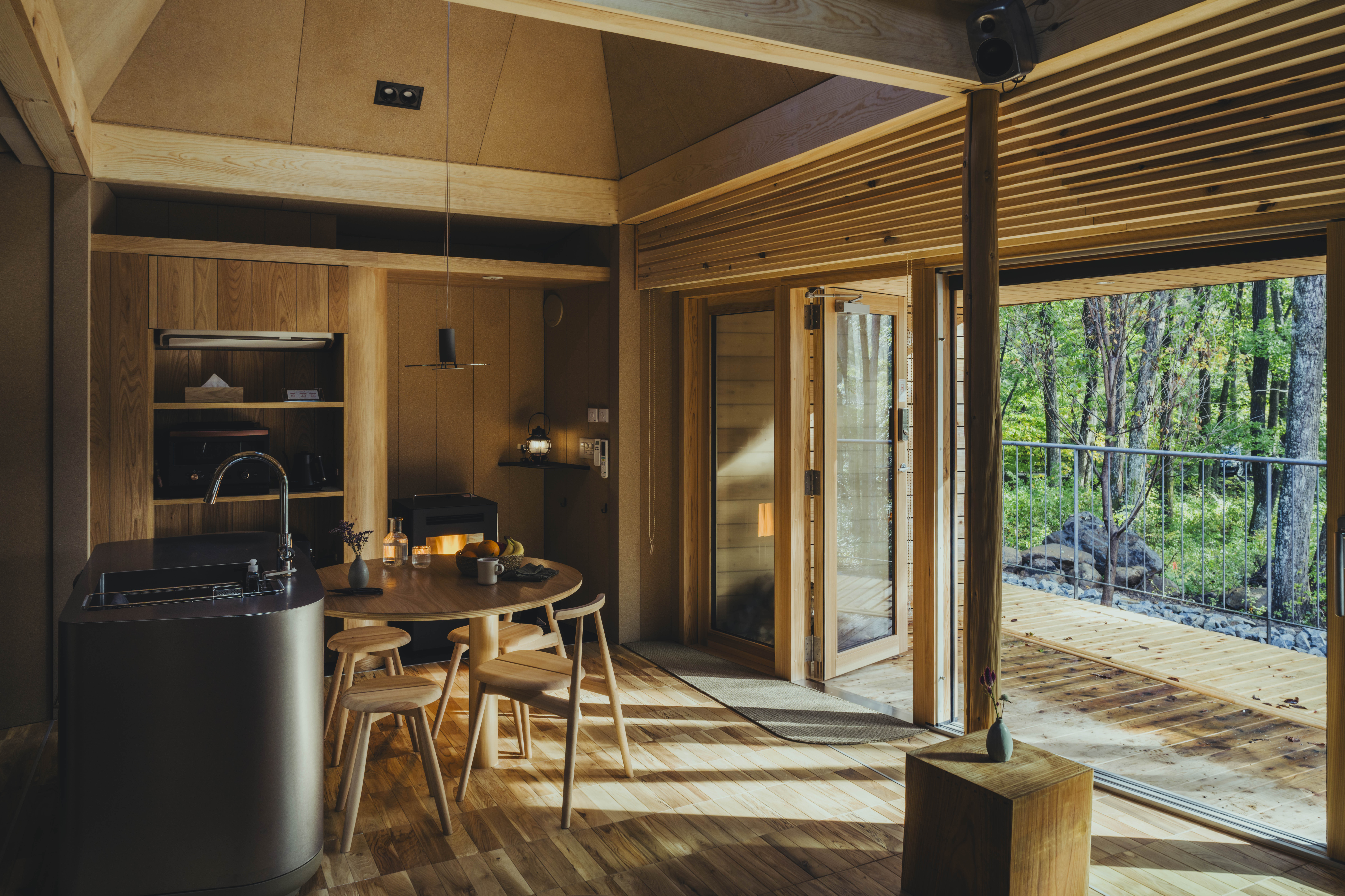 設計はADX 安齋好太郎氏が担当。自然とつながる暮らしをかたちにした全12棟のキャビンは、Mediumタイプ(屋内47.6㎡+バルコニー6.41㎡)と最大6名まで滞在できるLargeタイプ(全3棟)にはプライベートサウナも併設されています。