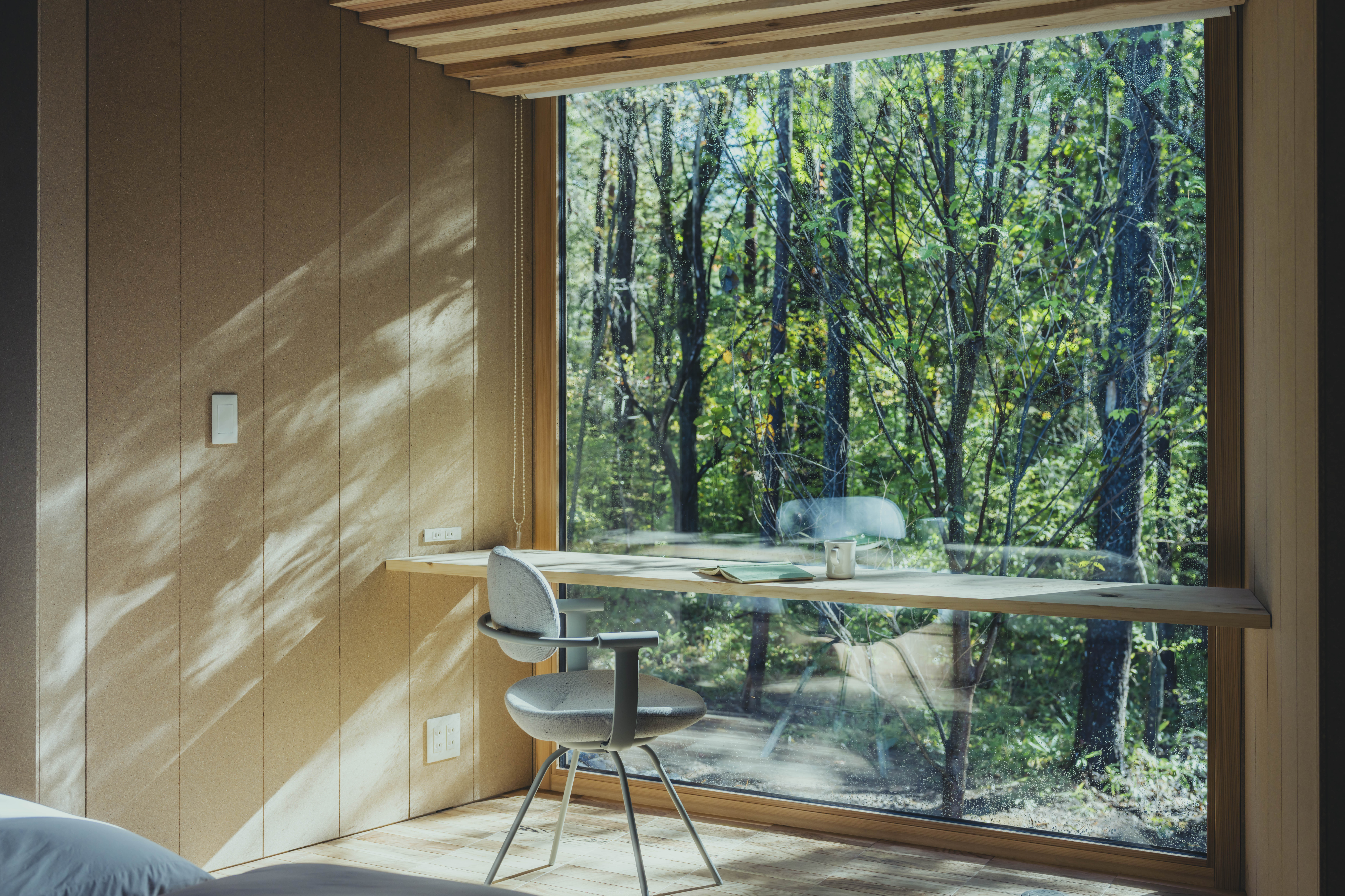 リビングとバルコニーがシームレスにつながり、床から天窓、そして森や空へと視線が抜ける空間設計が特徴。木のぬくもりと窓の外の緑が自然と調和し、暮らしの中に溶け込むような建築です。