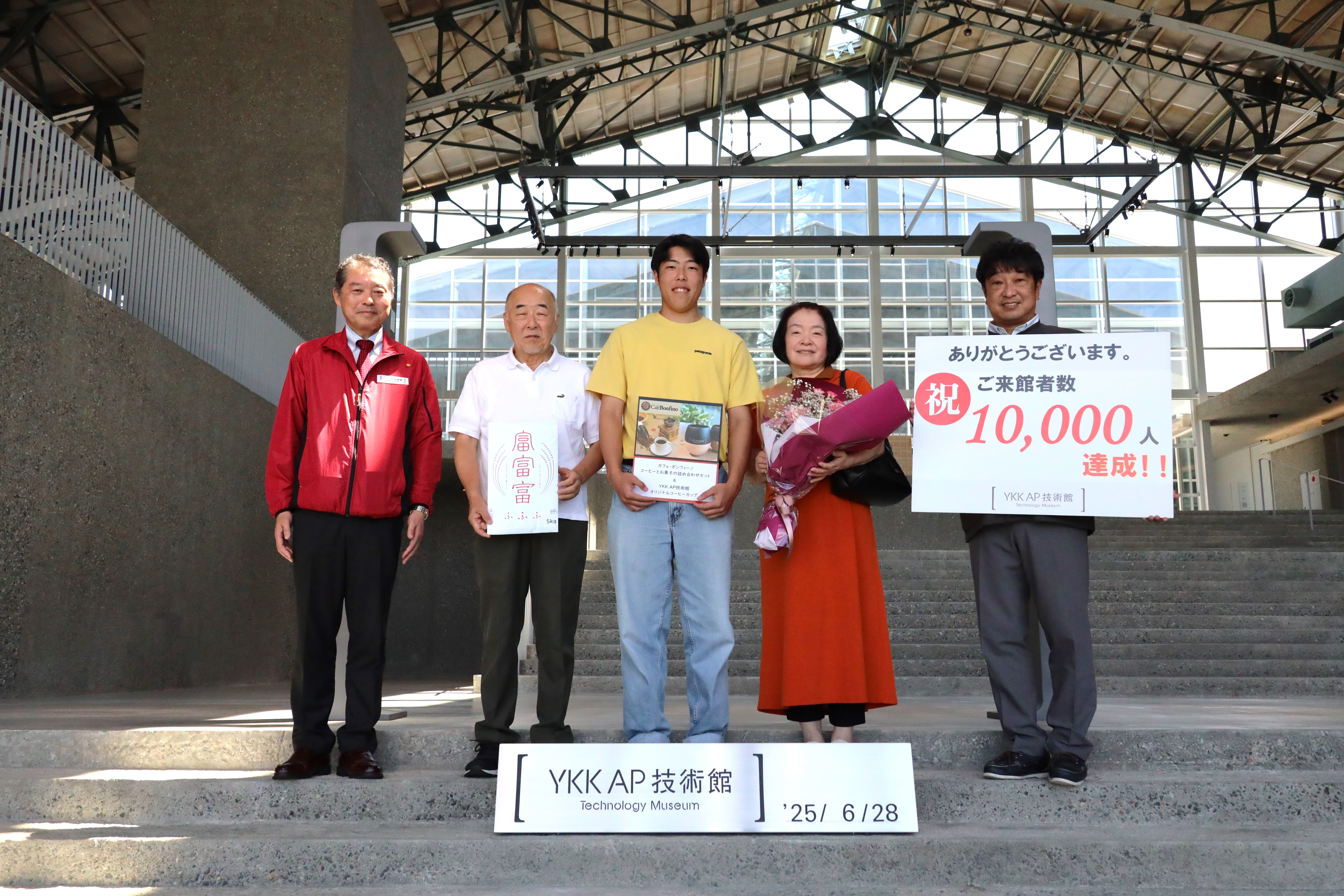 1万人目の来館者となったのは富山県黒部市からお越しになった笠原 洋子(かさはら ようこ)様ご家族でした。来館について「孫が大学3年生の就職活動中でYKKグループも希望先として検討しているので、会社を知る役に立てばと思い孫と一緒に訪れました。孫の話がなければ来ることはなかったと思いますし、1万人記念に選ばれたのはとてもびっくりしました。」と記念セレモニーについて感想をいただきました。