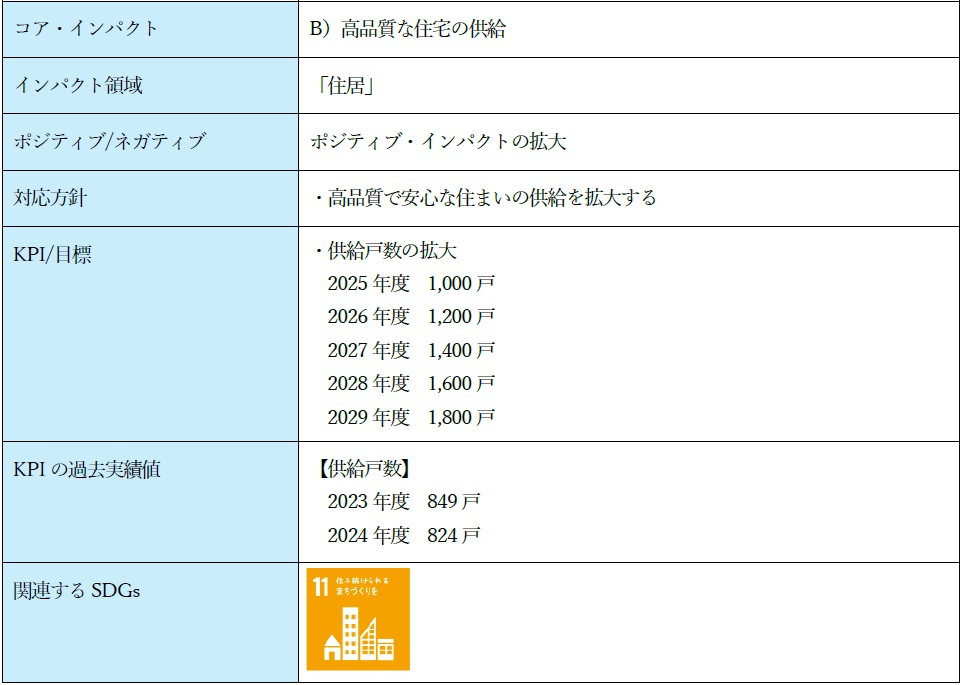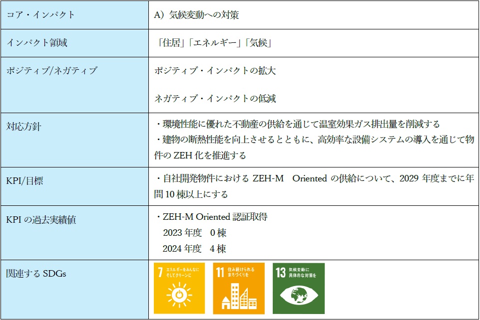 本取り組みにあたっては、SDGsの目標に対して特にインパクトを与える分野を中心に、コアインパクトを特定し、KPIを設定しました。具体的には、気候変動への対策、高品質な住宅の供給、ワークライフバランスの向上につながるKPIと、目標達成に向けた具体的な施策が選定されました。目標の達成状況については、継続的にモニタリングが実施されます。なお、本 PIF およびオリックス銀行の PIF 実施体制について、株式会社格付投資情報センター(R&I)より、国連環境計画金融イニシアティブのポジティブ・インパクト金融原則に適合している旨の第三者意見を取得しております。