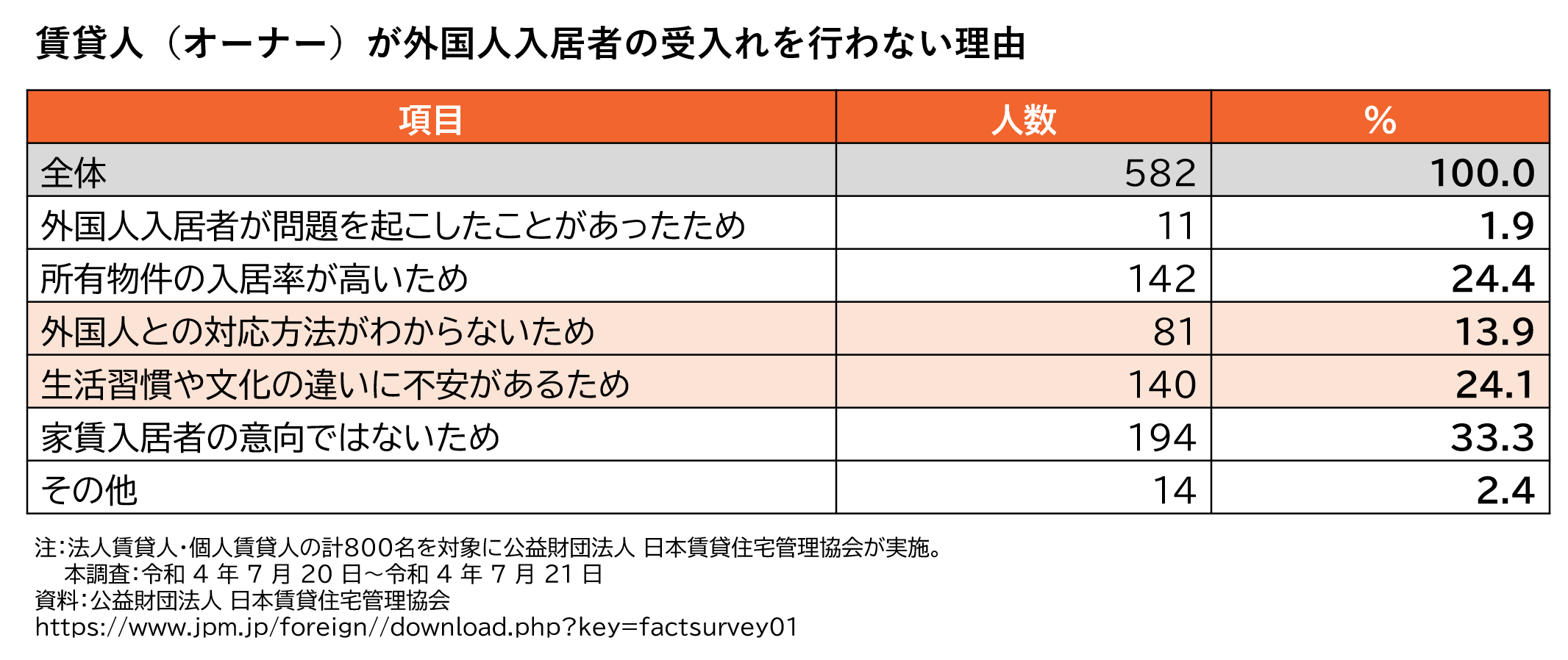 不動産物件を保有するオーナーが「外国人入居者の受け入れを行わない理由」をみると、実際に入居者が問題を起こしたことがあるから、ではなく、「外国人との対応方法がわからない」「生活習慣や文化の違いに不安がある」など、言語対応や生活習慣の認知・理解浸透にかかる負担・負荷を不安に思うことが理由になっています。