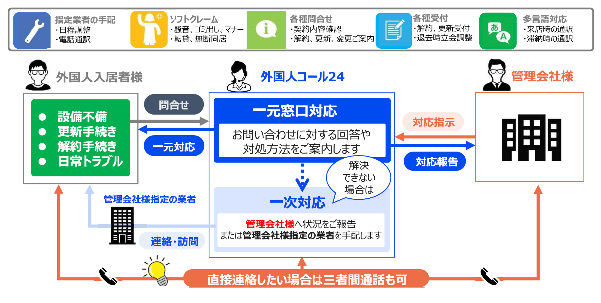 外国人入居者が連絡できるコールセンターを設置し、緊急時のトラブルにも必要に応じて管理会社と連携して対応。入居者が安心して生活できる環境を整えるとともに、不動産管理会社への負担・負荷を軽減します。