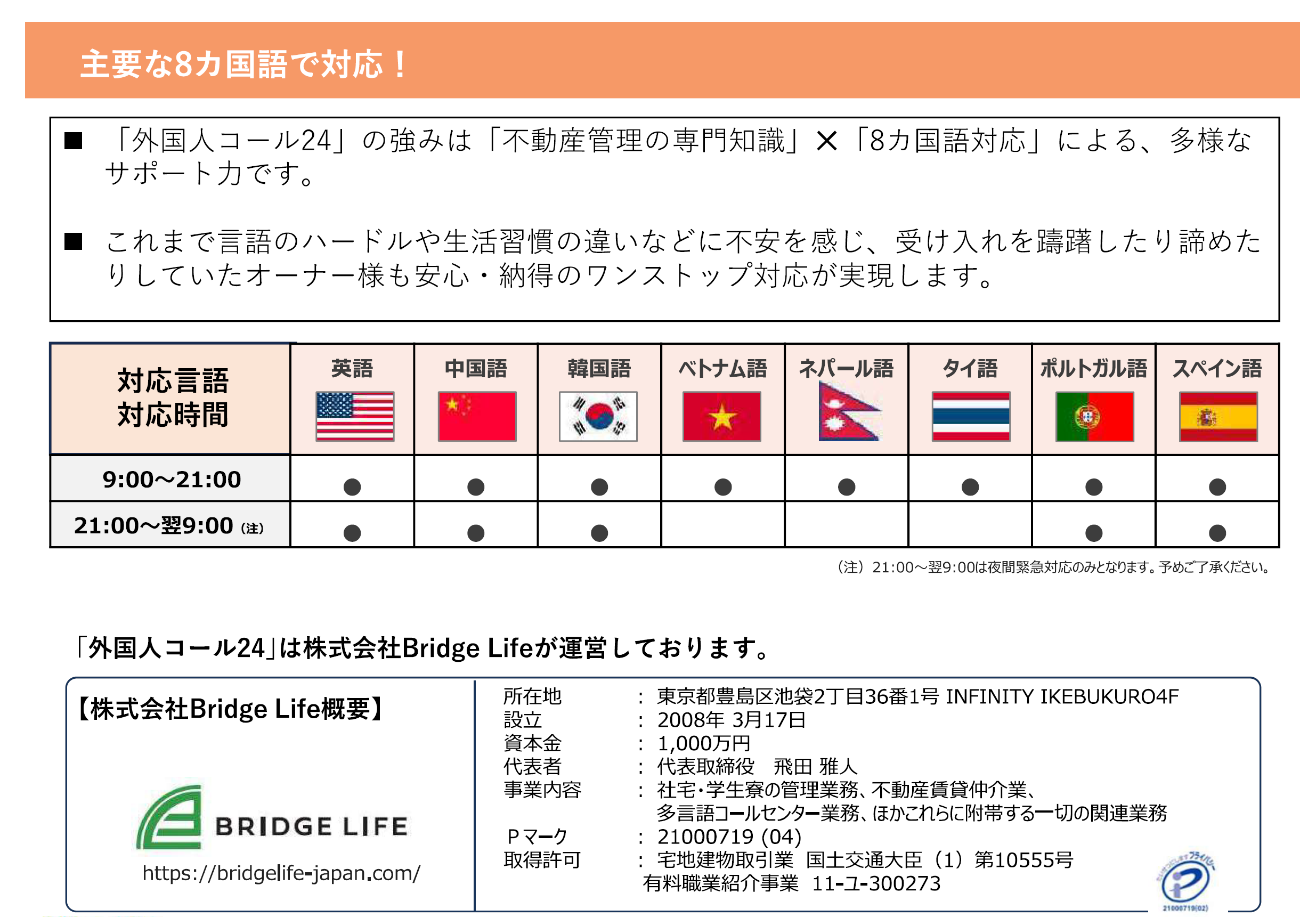 「ポータブル家賃保証 with 外国人コール24」は、当社が提供する家賃債務保証サービス「ポータブル家賃保証」に、株式会社Bridge Lifeが提供する多言語サポートサービス「外国人コール24」を付帯した新たなパッケージサービスです。