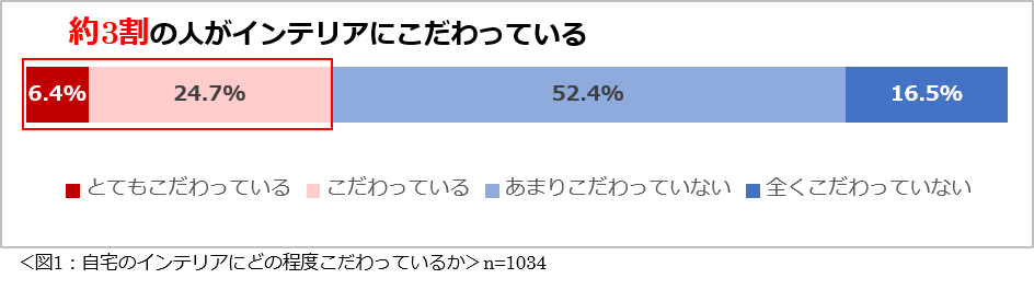 「自宅のインテリアにどの程度こだわっていますか?」と尋ねたところ、「とてもこだわっている」(6.4%)、「こだわっている」(24.7%)と回答した人を合わせると約3割の人が自宅のインテリアにこだわっていることが分かりました。(図1)