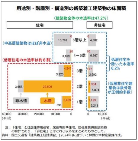 昨今、脱炭素への貢献が求められる中、建築中の CO2排出量を軽減し、建築物に炭素を長期間固定化できる木造建築物の需要が高まってきております。一方、住宅の中高層建築物や非住宅分野については、木造率が2024年時点で6.2%とまだ低く、今後の木造化が期待されているところです。