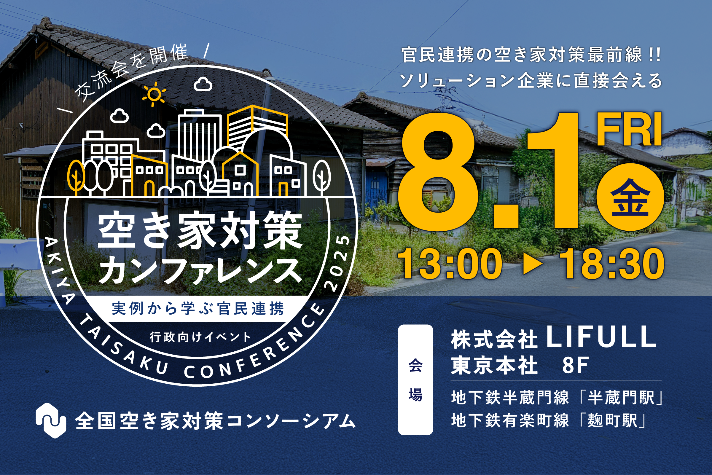当社が代表理事を務める日本の社会課題である空き家の増加抑制に取り組む全国空き家対策コンソーシアム(以下「本コンソーシアム」)主催の初めての対面イベント「空き家対策カンファレンス」を開催します。空き家対策を担当する自治体担当者向けに、官民連携で空き家対策を行う民間企業の情報収集や、交流ができるイベントです。官民連携で取り組みを実施する自治体の首長・担当者や、弁護士・国会議員による講演も実施します。