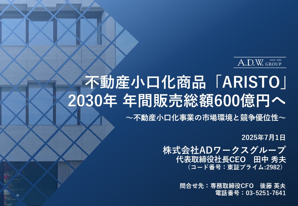 2025年6月30日付リリース「エー・ディー・ワークスの不動産小口化商品「ARISTO」上半期販売総額 前年同期比170% 企業成長を牽引」のとおり、ADWの不動産小口化事業は急成長を遂げており、当社グループ全体の企業成長を牽引しています。