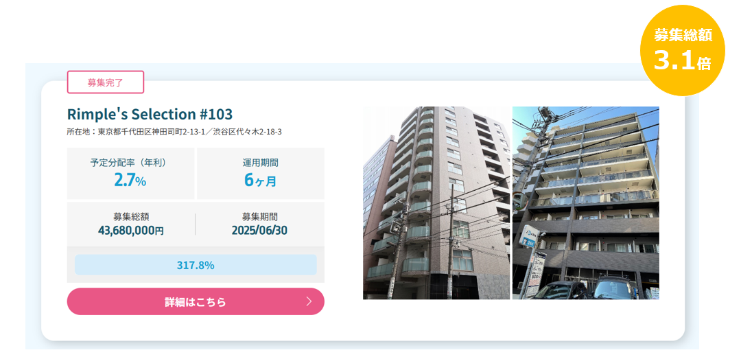 ホーム商品サービスプロパティエージェントの展開する不動産クラウドファンディングRimple’s Selection#103募集総額317.8%の1.38億円の応募