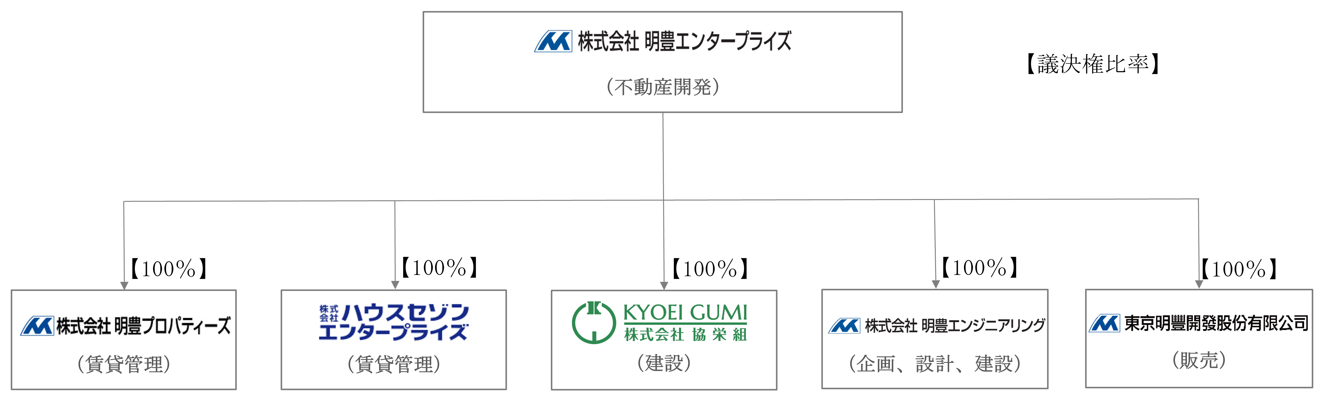 創業56年、物造りにこだわった信頼と実績の東証上場デベロッパーとして、東京23区を中心に200棟を超える“新築1棟投資用賃貸住宅”を供給している株式会社明豊エンタープライズ(東京都目黒区:代表取締役 矢吹 満)を親会社とし、賃貸管理会社の株式会社明豊プロパティーズ(東京都目黒区:代表取締役 竹内 智大)、株式会社ハウスセゾンエンタープライズ(京都府京都市:代表取締役 奥山 秀昭)、建設会社の株式会社明豊エンジニアリング(東京都目黒区:代表取締役 阪本 伸司)、株式会社協栄組(東京都世田谷区:取締役社長 徳満 亮輔)、海外現地法人の東京明豐開發股份有限公司(台北市中山区:代表取締役 内田千博)で構成されております。