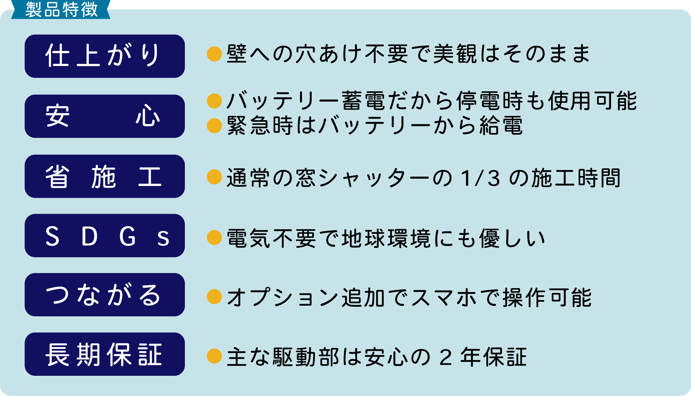 4. 配線不要で省施工:電気工事士資格や電気工事の知識を持たない施工者でも取り付け可能です。電気配線が不要なため配線で外観を傷つける心配がありません。また、施工時間は従来の電動窓シャッター取付工事と比較して約3分の1に短縮されます。