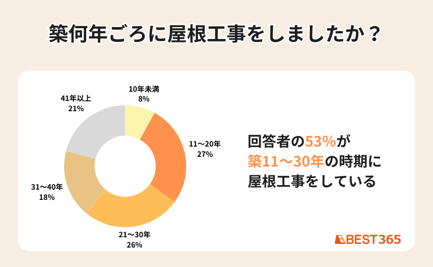 調査結果によれば、屋根工事を実施した時期について「築11〜20年」(27%)、「築21~30年」(26%)と、築11~30年の間に工事を行った人が過半数を占めました。これは屋根材の経年劣化が目に見えて現れる時期と重なっており、資産価値を守る観点からも理にかなったタイミングです。