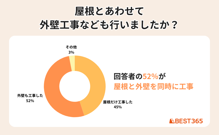 アンケートでは、52%の方が「屋根と外壁を同時に工事した」と回答しています。結果から、外壁塗装の際に屋根の状態も確認し、同時に工事をするケースが多いことがわかります。
