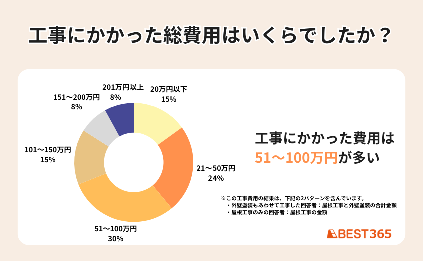 工事にかかった費用については「51~100万円」と回答した人が最も多く、全体の30%を占めました。次いで「21~50万円」が24%、「20万円以下」が15%となっており、全体の69%が100万円以下で工事を終えています。