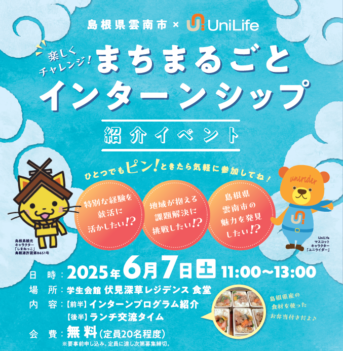 UniLife(ユニライフ)のブランドで全国の学生マンションの企画開発・仲介斡旋・運営管理までをトータルで行う株式会社ジェイ・エス・ビー(本社:京都府京都市、代表取締役社長:森 高広 以下、当社)は、島根県及び島根県雲南市と連携し、当社が運営する京都市伏見区の食事付き学生マンションの食堂スペースにて雲南市の魅力と課題、そして同市が地方創生に向けて取り組む大学生対象の長期インターンシップ「まちまるごとインターンシップ」を紹介する入居者イベントを6月7日に開催しました。