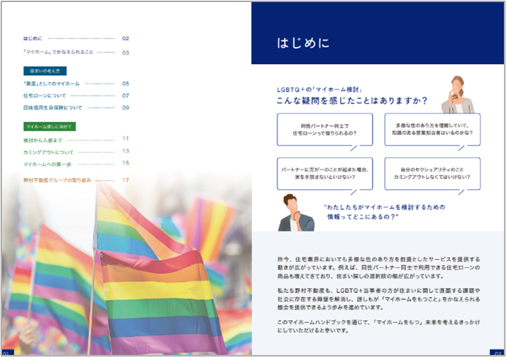 そのような中で、グループ各社からも独自の取組みが複数生まれており、野村不動産の住宅部門では2023年に、「ジェンダー平等・LGBTに関わるお客様対応ガイドライン」を策定し、全国のマンションの販売拠点にて導入、自発的に「アライチーム※2」を組成し、顧客サービスや風土醸成に活かす活動を行ってきました。本ハンドブックはアライチームでの取組みの一環であり、「LGBTQ+当事者の方が住まいに関して直面する課題や社会に存在する障壁を解消し、誰しもが自分らしい住まいを実現できる機会を提供したい」という思いから制作しました。「同性パートナー同士で住宅購入を検討するためには?」、「セクシュアリティのことをカミングアウトしなければならないの?」等、LGBTQ+当事者の方のマイホーム検討時における疑問を解消し、マイホームを持つ未来を考えるきっかけにしていただくためのものです。制作にあたっては、株式会社JobRainbow(本社:東京都千代田区/代表取締役CEO:星 賢人)の監修を受け、LGBTQ+当事者の方へのインタビューを行いながら、当事者の方たちがマイホームを持ちたいと考えた時に、まず手にとっていただけるハンドブックとなるように必要な情報をまとめ、このたび公開に至りました。