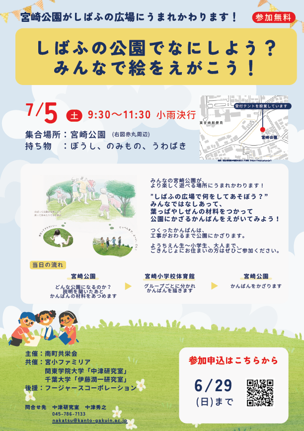 株式会社フージャースコーポレーション(本社:東京都千代田区 代表取締役社長:小川 栄一)、及び千葉市中央区南町共栄会、宮小ファミリア、関東学院大学(中津研究室)、千葉大学(伊藤潤一研究室)は、千葉市中央区宮崎一丁目の宮崎公園にて公園リニューアルに向けた「ワークショップ」を、7月5日(土)9:30~11:30で開催します。