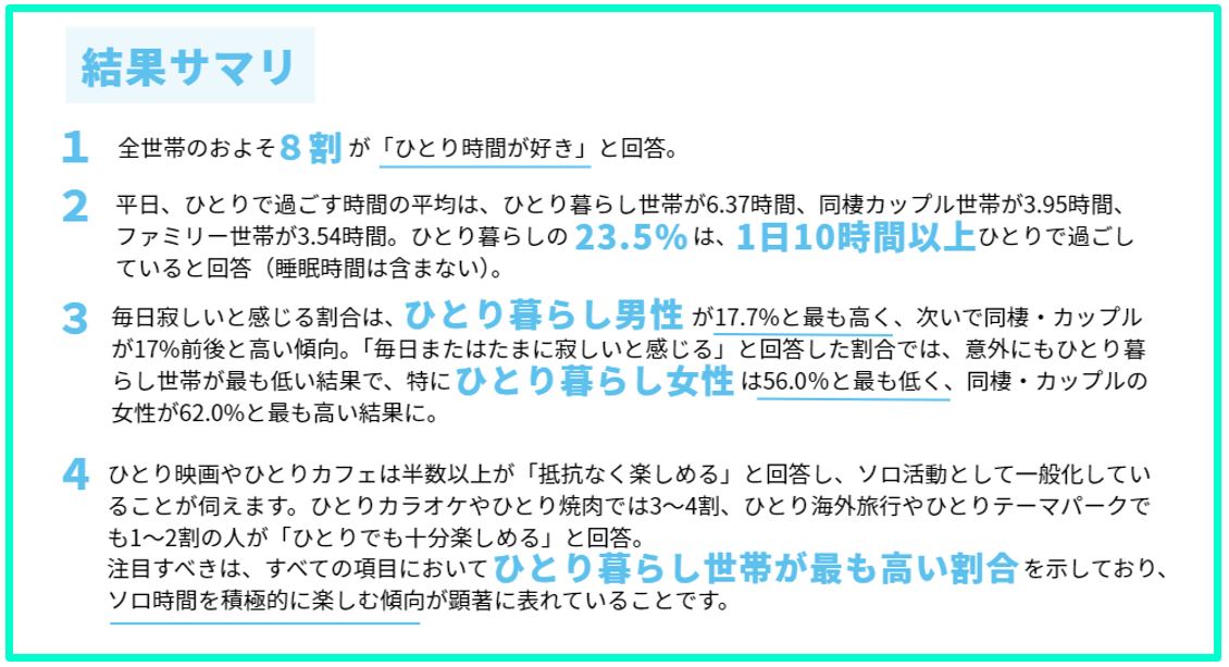 ひとり暮らしやひとり時間の過ごし方に関する意識調査の結果をご報告いたします。