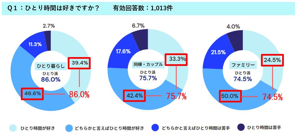 「ひとり時間が好き」と回答した人は、ひとり暮らしが39.4%と最も多く、「ひとり時間が好き、またはどちらかと言えばひとり時間が好き」では、ひとり暮らしの86.0%、同棲カップルの75.7%、ファミリーの74.5%と、全体の8割前後がひとり時間が好きだと感じていることが分かります。