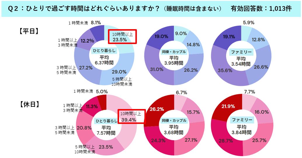 休日のひとり時間では「ひとり暮らし7.57時間」、「同棲・カップル3.68時間」、「ファミリー3.84時間」と、ひとり暮らしの39.4%が10時間以上ひとりで過ごすと回答しており、平日以上に長時間のソロ時間を満喫している様子が伺えます。休日では同棲・カップルよりファミリーの方がひとり時間が長くなっており、家族がいてもそれぞれが個の時間を大切にしている現代の家族像が見えてきます。