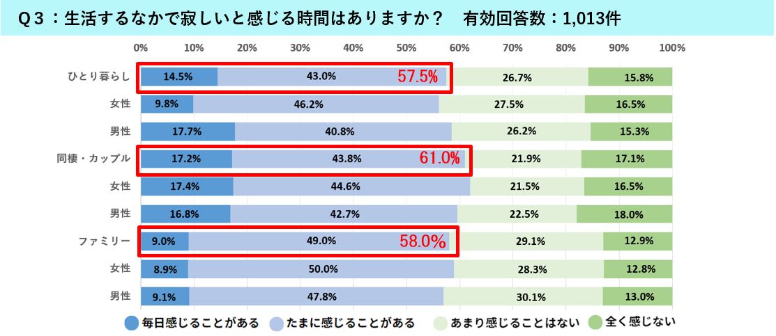 毎日寂しいと感じると回答したのはひとり暮らし男性が17.7%と最も多く、次いで同棲・カップル女性が17.4%という結果に。「毎日寂しいと感じる、たまに寂しいと感じる」をあわせると、同棲・カップルが61.0%、ファミリーが58.0%に対して、ひとり暮らしは57.5%と、意外にもひとり暮らし、特にひとり暮らしの女性が最も寂しさを感じていない結果に。