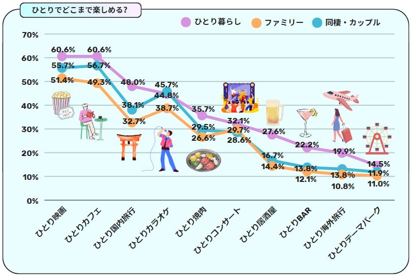 近年のおひとりさまブームを背景に、ひとりで気兼ねなく利用できるサービスやお店が急速に増えています。それに伴い、「ひとり○○」の選択肢もますます多様に。今回の調査でも、「ひとり映画」や「ひとりカフェ」は、すべての世帯で半数以上が抵抗なく楽しめると回答しており、今や定番のひとり時間の過ごし方となっていることがうかがえます。