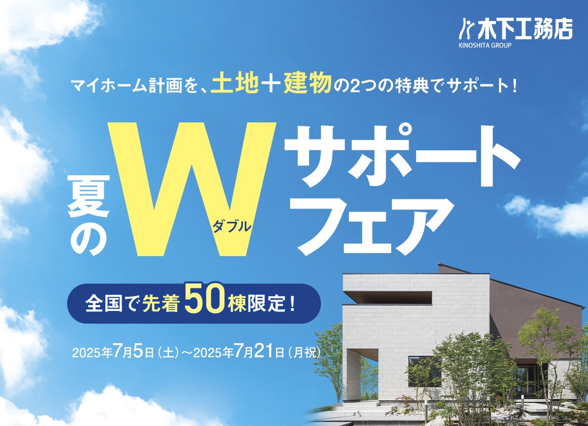 木下グループ 株式会社木下工務店(本社:東京都新宿区/代表取締役:田中耕三郎)は、「夏のW(ダブル)サポートフェア」を2025年7月5日(土)から2025年7月21日(月・祝)まで全国先着50棟限定で開催いたします。土地から住まいづくりをお考えのご家族を、土地購入サポートと住まいの性能アップの両面から応援するお得な特典をプレゼントいたします。