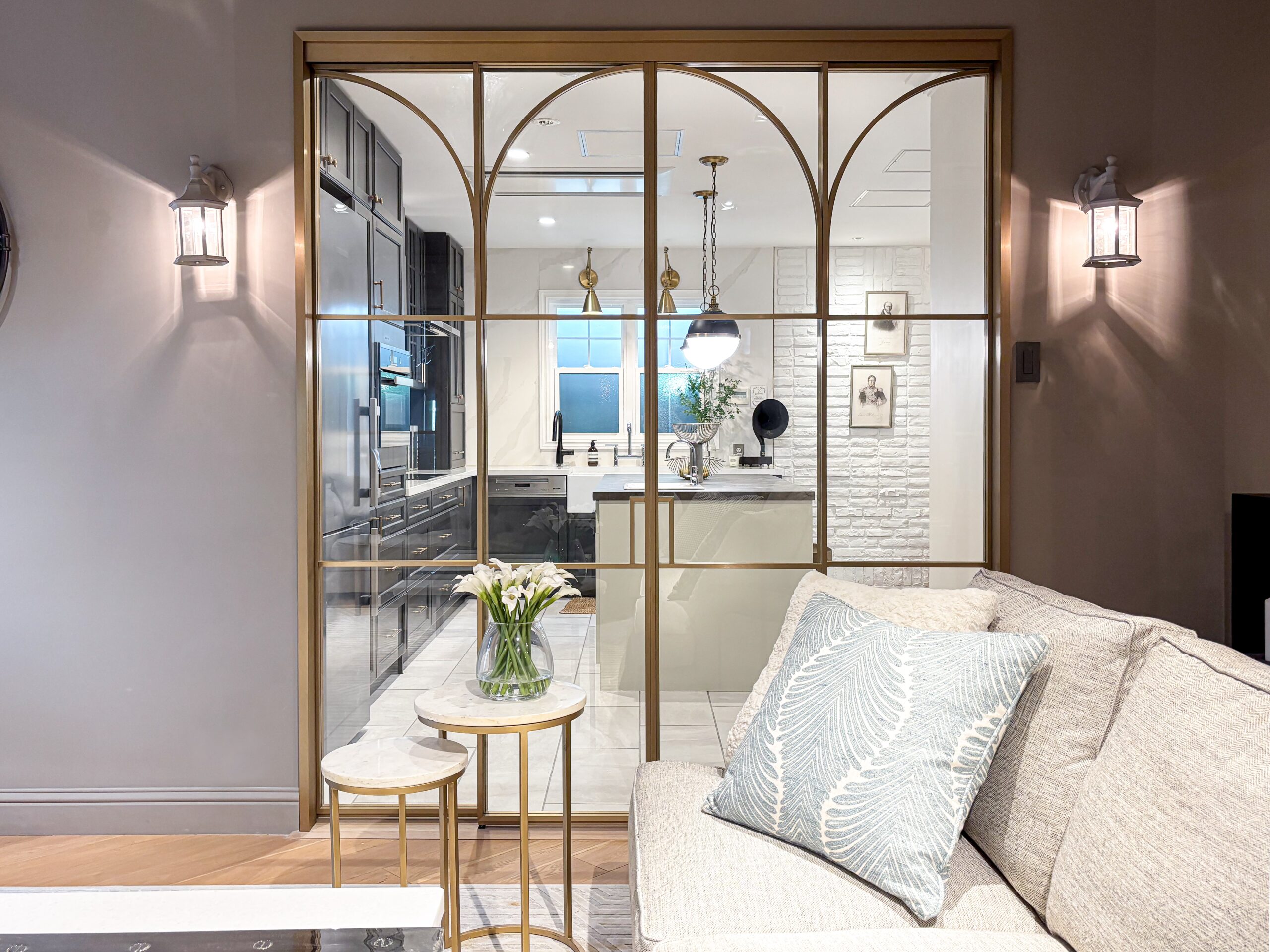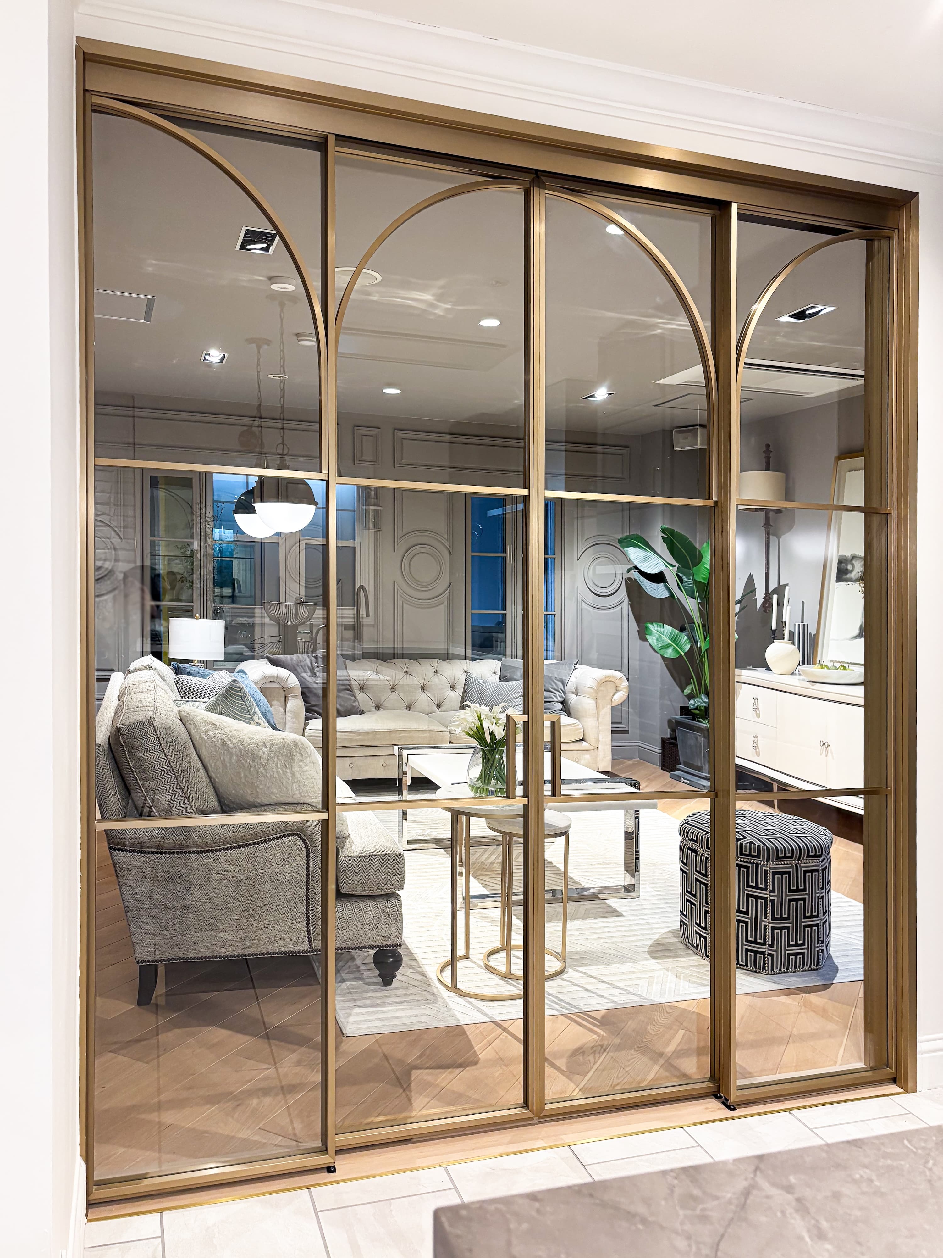 複数枚を連ねた構成により、視線の抜けや光の導線を確保しつつも、空間の印象をワンランク上に引き上げます。アーチ状の上部ラインは、柔らかさと上質感を空間全体に演出します。
