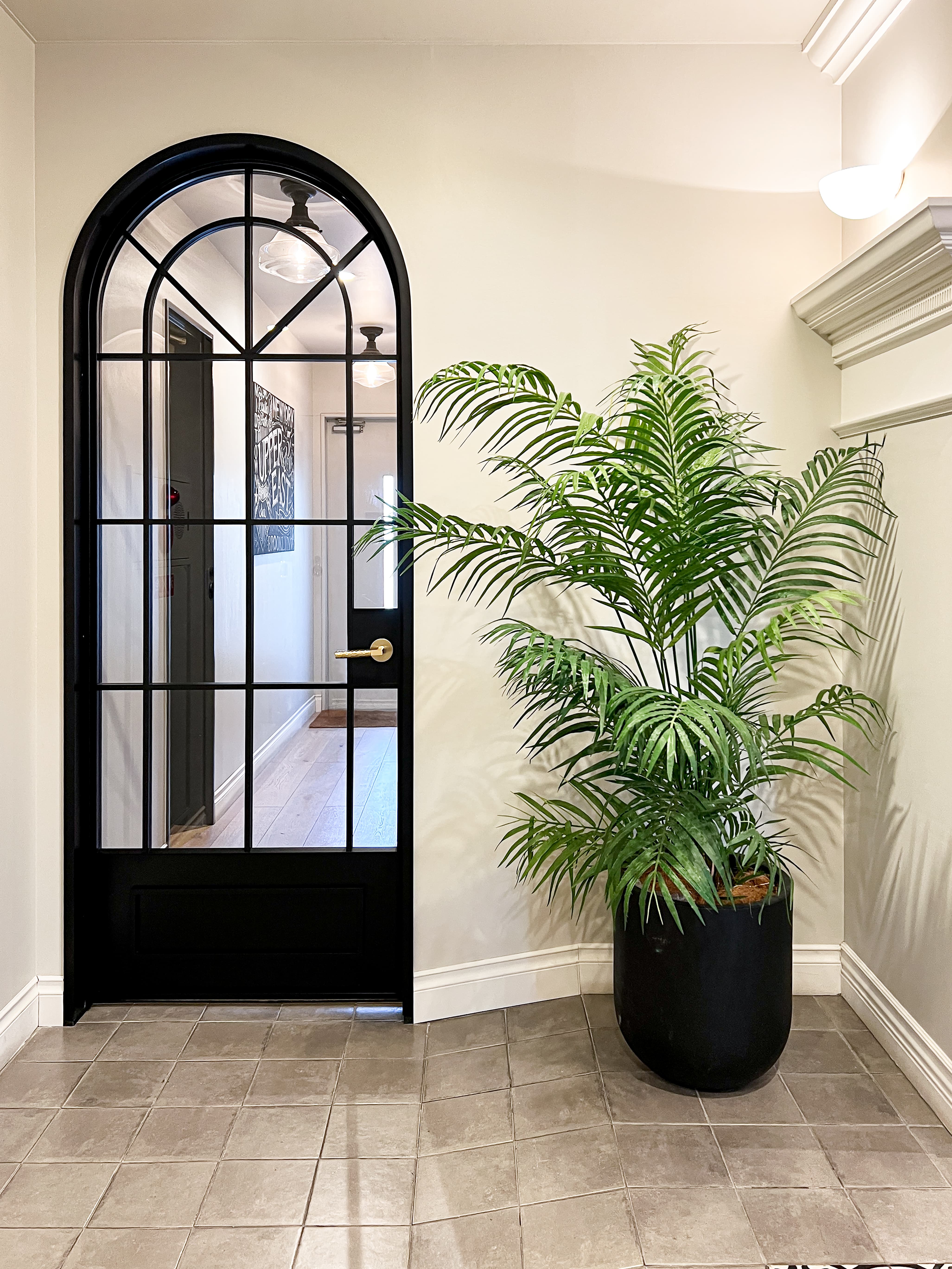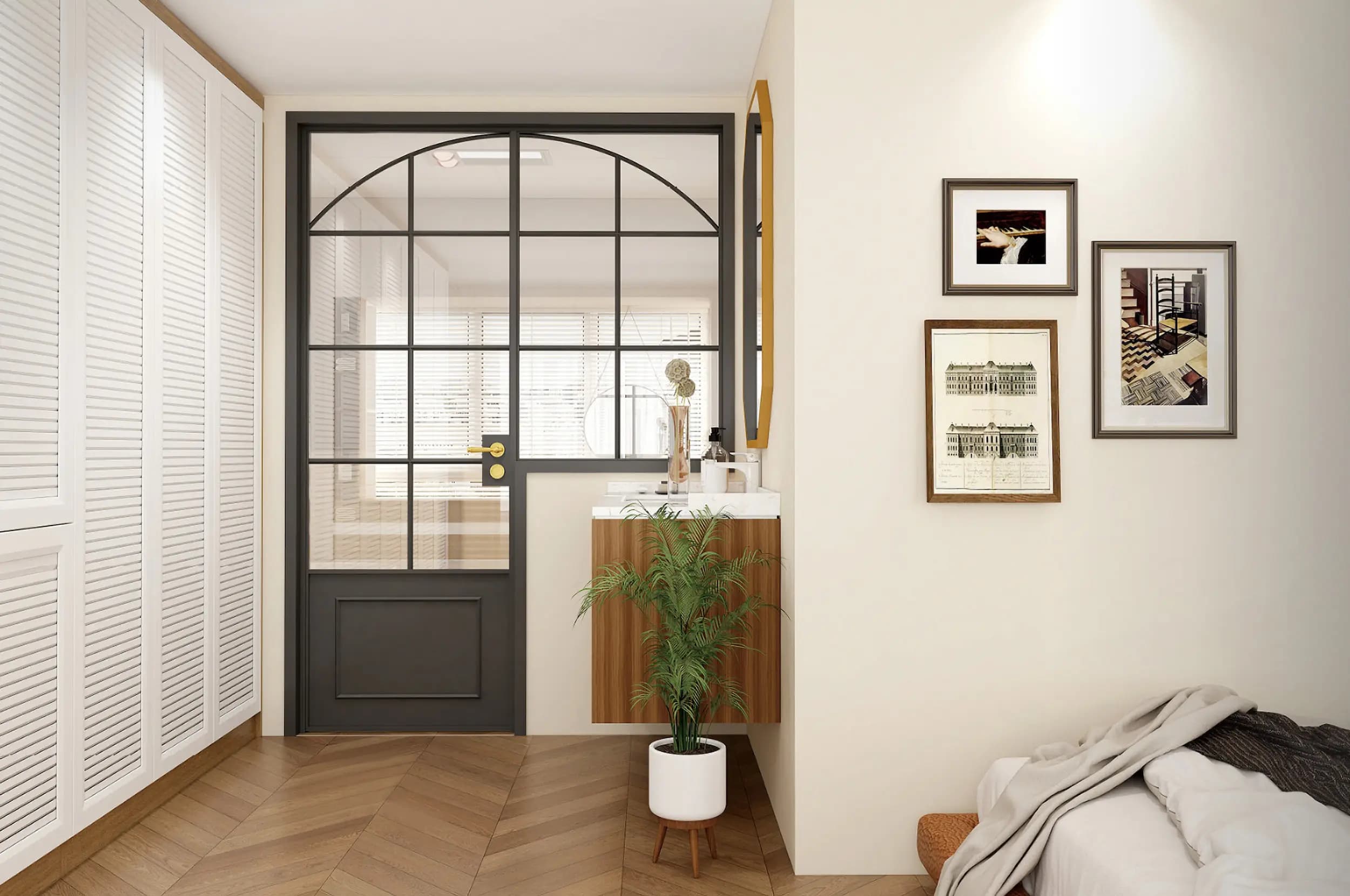 クラシカルな佇まいのアーチデザインが印象的なスイングドア。細身のブラックアルミフレームとガラスによって、空間に抜け感と明るさをもたらしつつ、高いデザイン性を兼ね備えた一枚です。