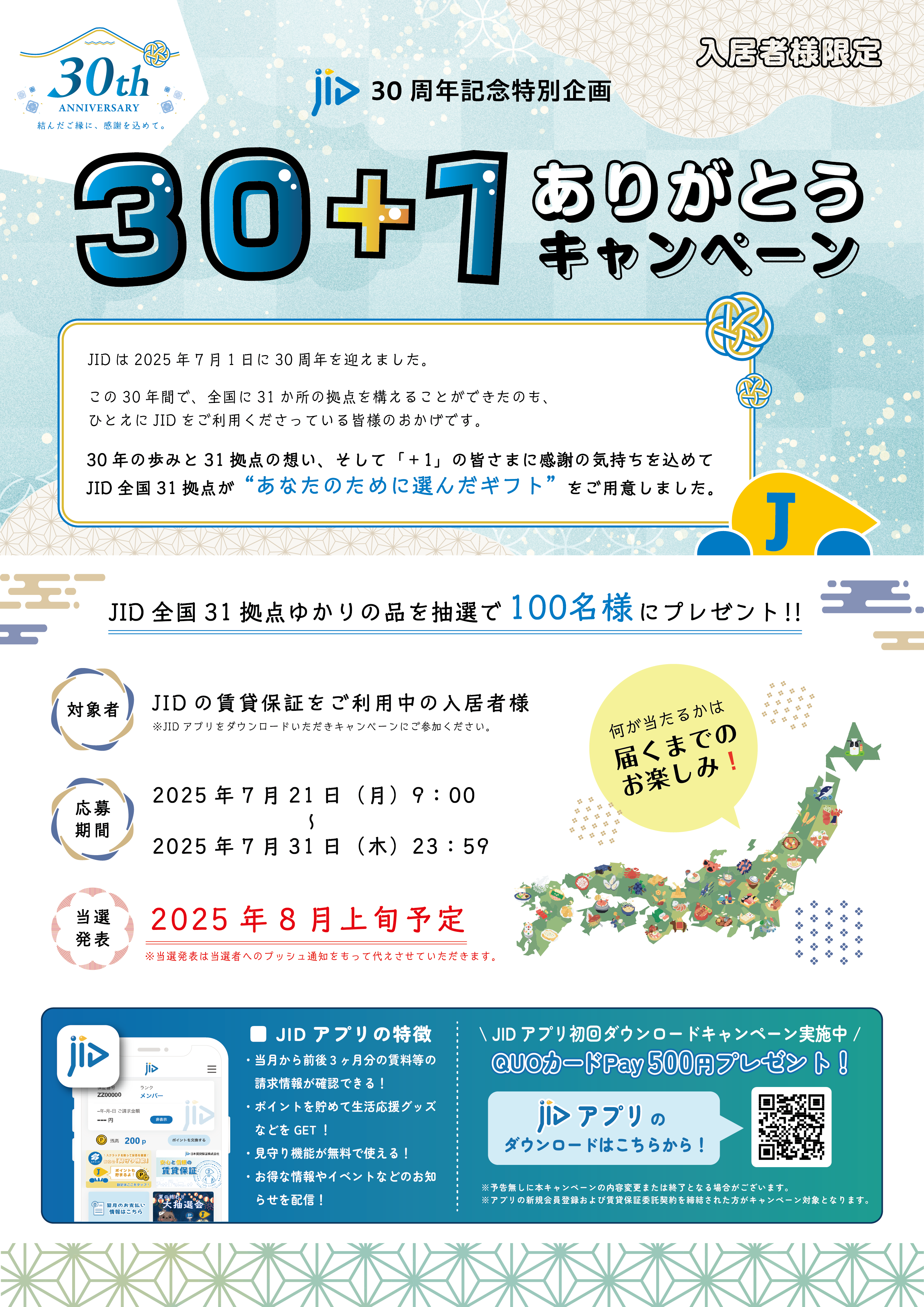 賃貸借の保証事業を展開する日本賃貸保証株式会社(本社:千葉県木更津市、代表取締役:梅田 真理子、以下「JID」)は創業30周年を記念し、賃貸保証をご利用中の入居者様を対象に抽選会を開催いたします。