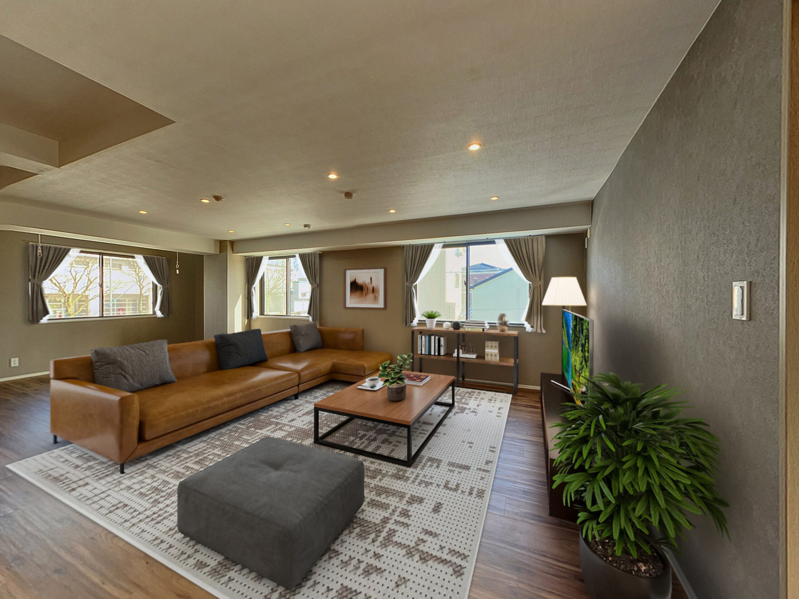 通路を抜けた先には、都市部では希少な31.5帖の大空間リビングが広がります。グレーを基調にしたシンプルなトーンが空間全体に“視覚の静けさ”を与え、家具・光・空気の流れすらも計算された設計によって、「何もしなくても整う空気」が漂います。心理学では、このような広がりのある空間は包容性と安全性の感覚をもたらし、副交感神経を優位に。リラックス・集中力・自己肯定感の回復に効果的とされています。