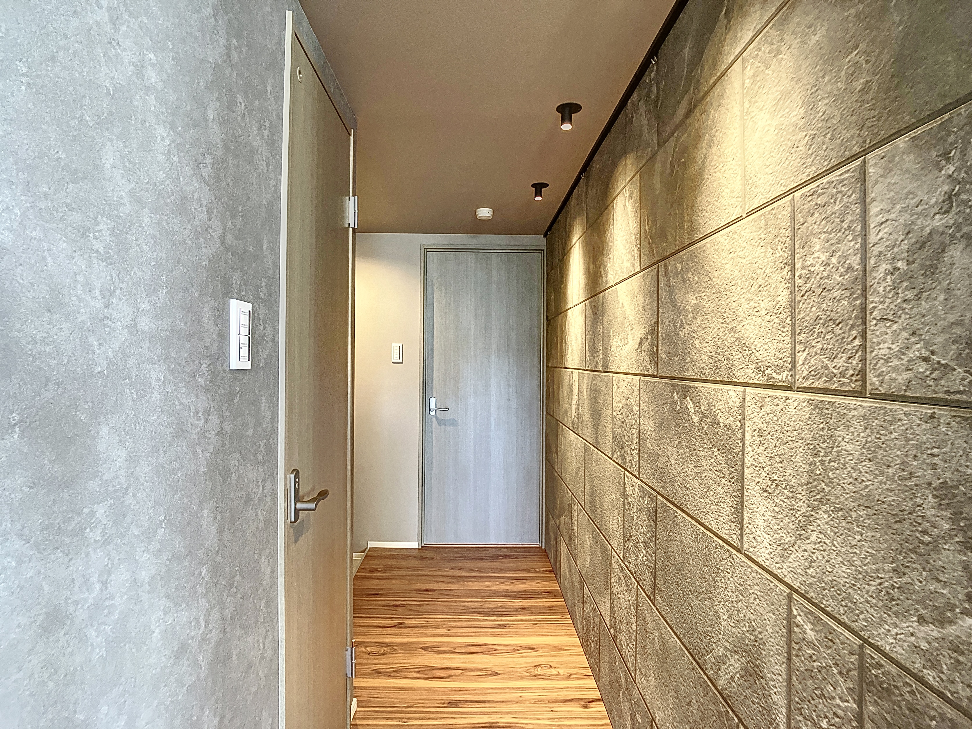玄関を開けると、目の前に現れるのは、自然石を思わせる質感の壁。その重厚なテクスチャーは、地面に根を下ろすような“安心感”と、“日常から非日常への切り替え”を生みます。