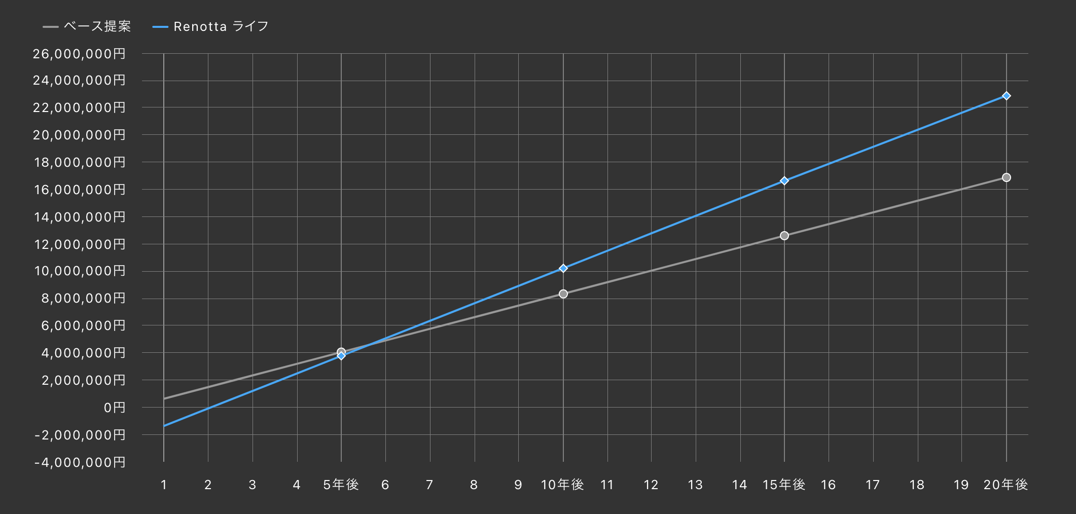 投資効果を検証するために、通常の原状回復工事を行った場合の税引後キャッシュフローと、今回のリノベーションを行った場合の税引後キャッシュフローを比較するシミュレーションを行なった結果、約5年で収益が逆転し、10年後には約170万円の差益が見込まれる結果となりました。