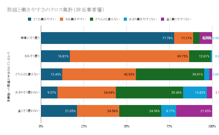 非当事者層と当事者層で比較した場合、非当事者層では「まあそう思う」「非常にそう思う」とした割合が27.6%であるのに対して、当事者層では32.1%となるなど当事者のほうがより働きやすさに配慮されていると感じていた。