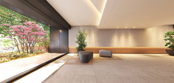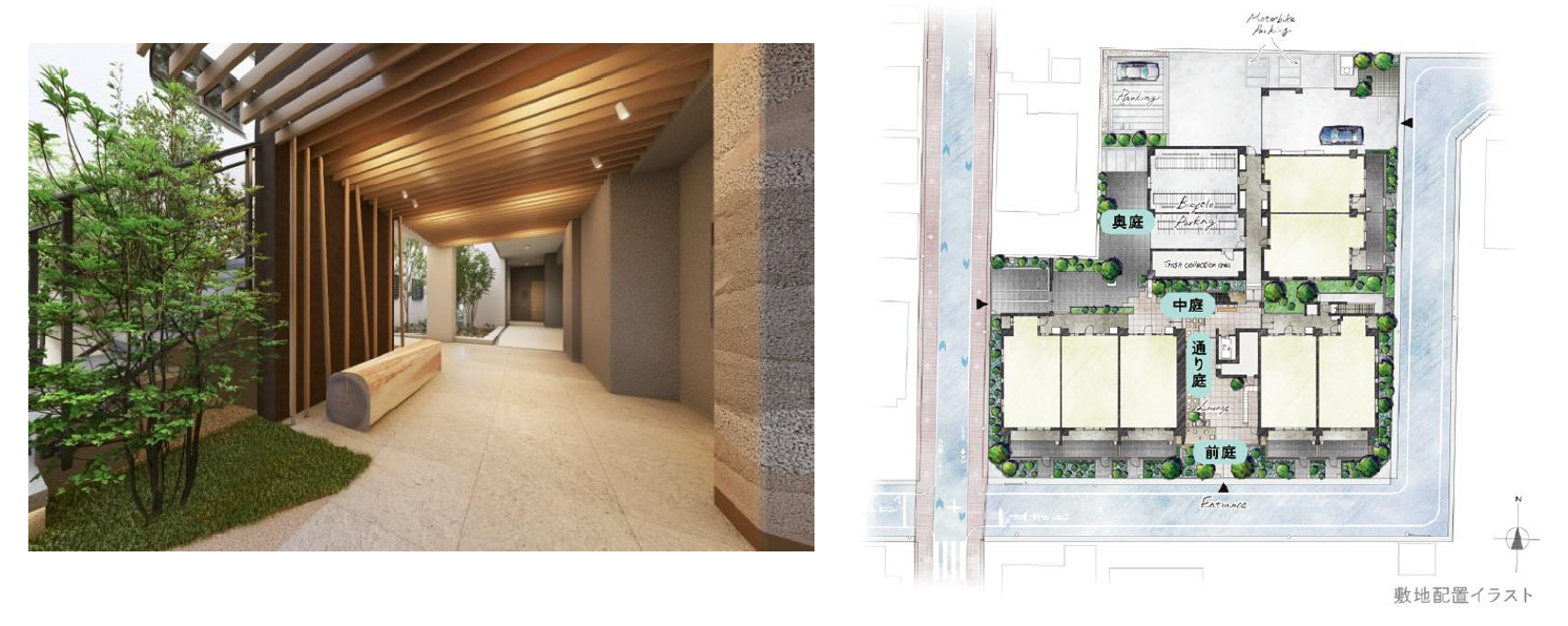 空に浮かぶ雲のようなランダムなデザインを取り入れることで、個性的で清々しい外観を形成。エントランスや共用部では、地層をイメージしたウォール、天然の石が敷かれたような雰囲気を生む天然の石を使用した床面など、外の自然を引き込むようなデザインを採用。前庭・通り庭・中庭・奥庭の4つの庭が住まいに奥行きとやすらぎを与え、自然と調和した落ち着きのある住環境を実現しています。