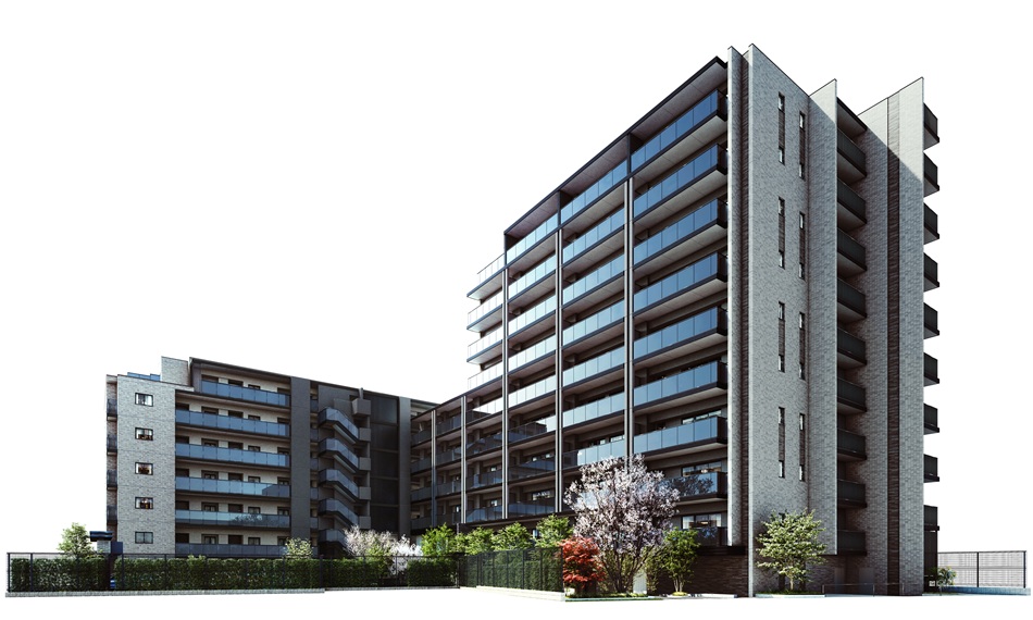 敷地内には3つの庭園を配し、都心近くのマンションにおいても緑の中でくつろげる空間を備えました。建物は、南向き・東向きの2棟構成、間取りは2LDK(44.88m2)~3LDK(82.73m2)とし、全戸のリビング・ダイニング・キッチンの天井(一部)には、吸音・消臭・調湿性能を併せ持つ天井材を採用するなど、快適性を高めました。