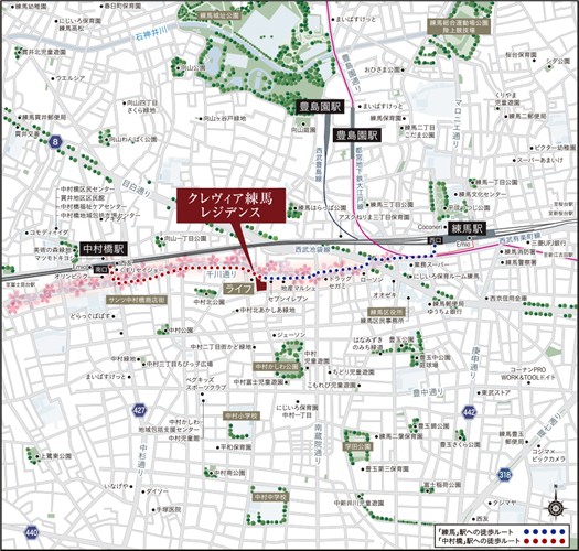 西武池袋線・西武豊島線・西武有楽町線「練馬」駅より徒歩10分※、さらに「中村橋」駅や都営大江戸線「練馬」駅の2駅4路線が利用可能で、池袋・新宿・渋谷など都心の主要駅へ直通でアクセスできる利便性の高さが魅力です。また、本物件は、練馬駅から千川通りの桜並木を抜けた先のスーパーマーケット「LIFE」に隣接しているほか、練馬駅と中村橋駅周辺に広がる複数の商店街も日常使いできる立地のため、生活利便も高いロケーションです。