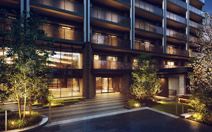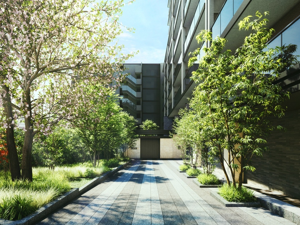 都心近くのレジデンスでありながら、緑の中でくつろぎ、四季の移ろいを楽しめるよう、ゆとりのある敷地内にはヤマザクラをシンボルツリーとした「迎賓の庭」、ベンチやスツールを備えた「ふれあいの庭」、エントランスホールからの眺めをデザインした「景観の庭」の3つの庭園を設けました。白い花を咲かせる木々を中心としたに四季折々の植栽計画により、一年を通して楽しむことができる潤い豊かなランドスケープを描いています。