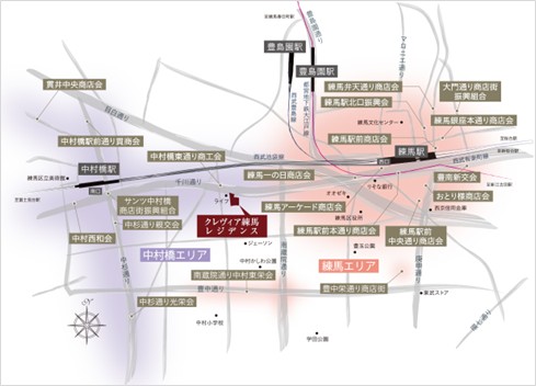 「クレヴィア練馬レジデンス」は、西武池袋線の快速急行停車駅「練馬」駅より徒歩10分、西武池袋線と西武豊島線、西武有楽町線、都営大江戸線の2駅4路線が利用でき、都心の主要駅へ直通でアクセスできる利便性の高さが魅力です。本物件は大型のスーパーマーケット「LIFE」に隣接しているほか、練馬駅と中村橋駅周辺に広がる複数の商店街が日常使いでき、生活利便にも優れています。また、練馬駅周辺は、行政や文化の中心的な役割を果たす区の中枢エリアのため、練馬区役所を中心に公共・文化施設も充実しています。