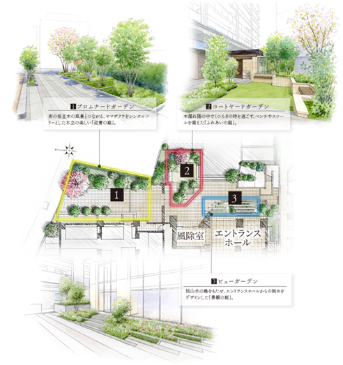 ■四季の移ろいを楽しめる緑豊かな3つの庭園を設けたランドスケープ