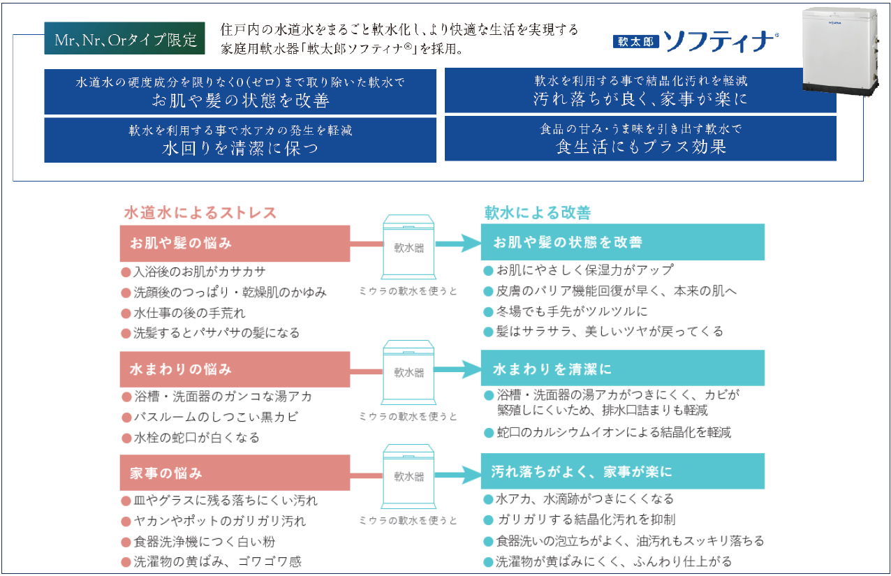 建物は南向き・東向きの2棟構成とし、間取りは2LDK/44.88m2~3LDK/82.73m2をご用意しました。全戸のリビング・ダイニング・キッチンの天井(一部除く)には、吸音・消臭・調湿性能を併せ持つ天井材「クリアトーン12SII」を採用しました。音の反響が抑えられることで室内の音が聞き取りやすくなったり、暮らしの中のニオイを抑えたり、湿気の吸収・放出効果が期待できます。また、一部の住戸には、水道水の硬度成分を限りなく 0(ゼロ)近くまで取り除くことができ、お肌や髪に優しく、水アカ発生の軽減にも繋がる家庭用軟水器「軟太郎ソフティナⓇ」を導入しました。機能的な設備導入により、快適な暮らしをご提供いたします。