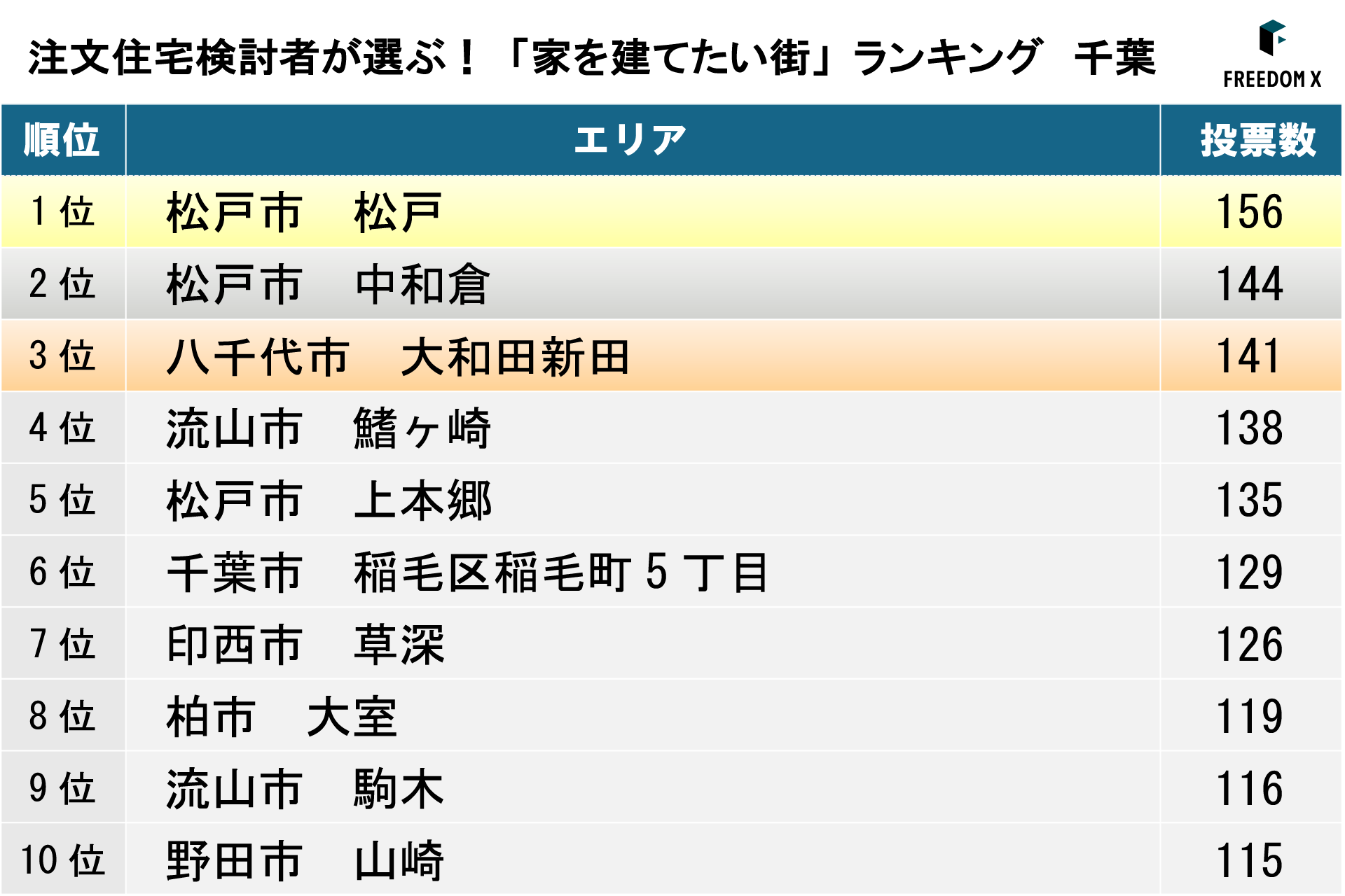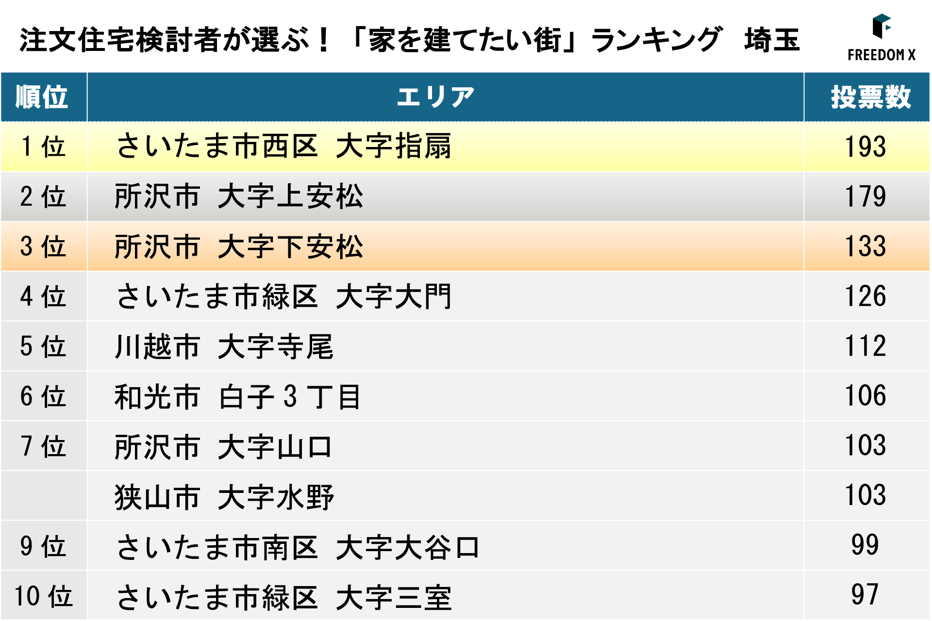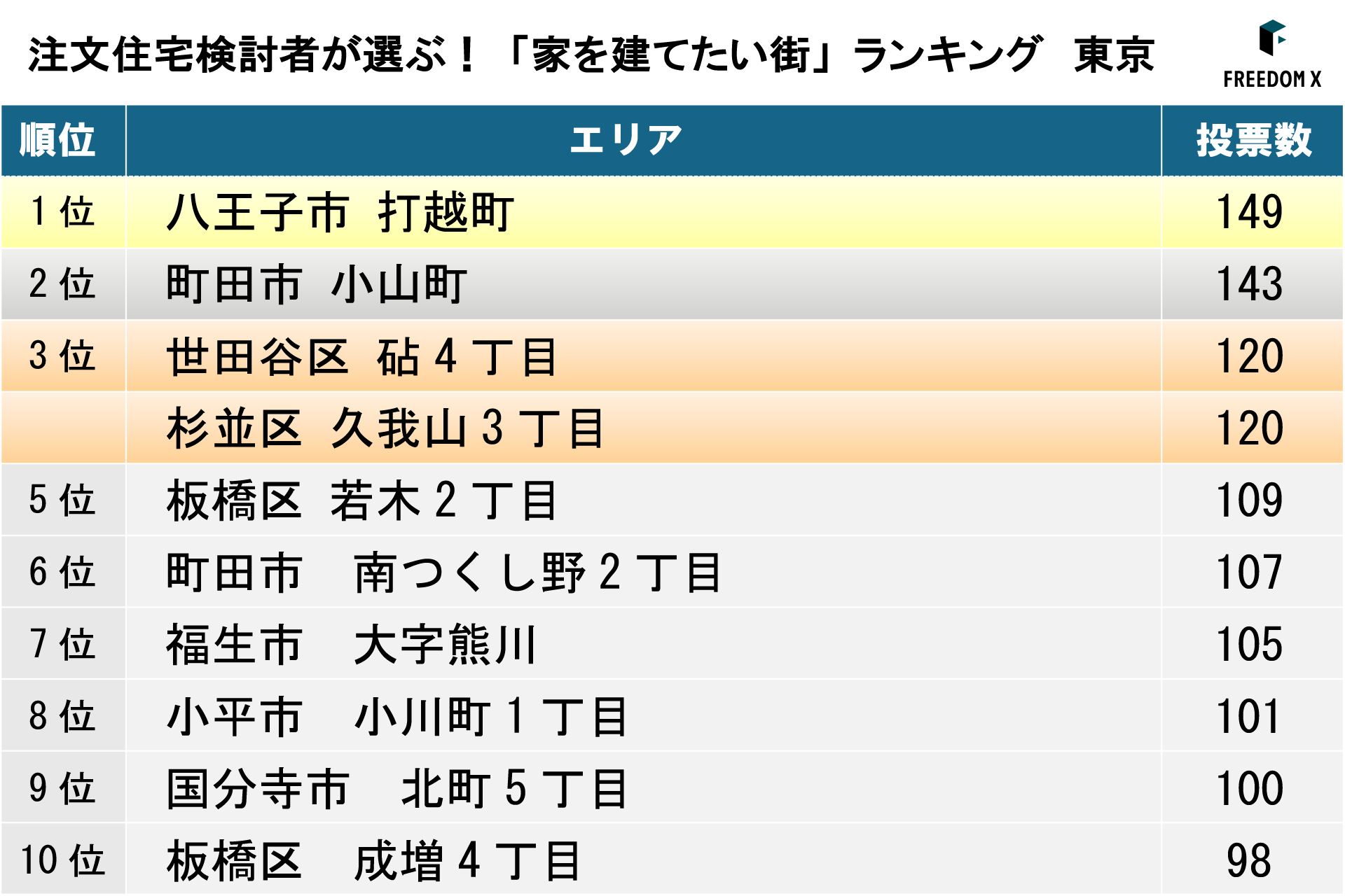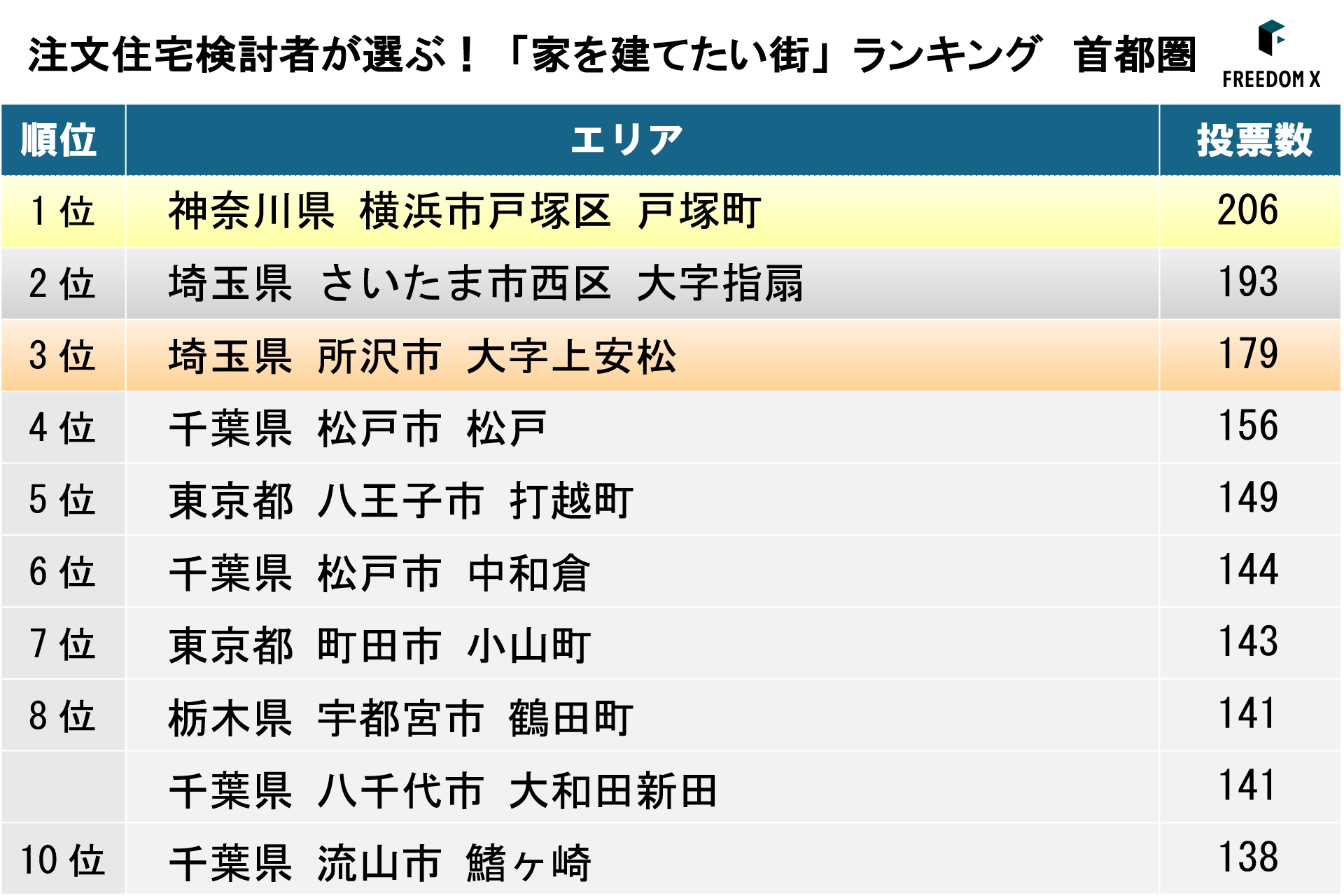建築・不動産領域のDXを推進するFREEDOM X株式会社(本社:東京都中央区、代表取締役社長:衣笠茂樹、以下「当社」)は、当社が運営する土地探しアプリ「ランディ」に掲載された土地物件のうち、首都圏エリア(東京都、神奈川県、埼玉県、千葉県、茨城県、栃木県、群馬県)を対象に、お気に入り登録数を集計した「家を建てたい街ランキング」を発表しました。あわせて、注文住宅検討者が土地探しアプリを通じて実際に購入を検討しているエリアの傾向についても調査しています。