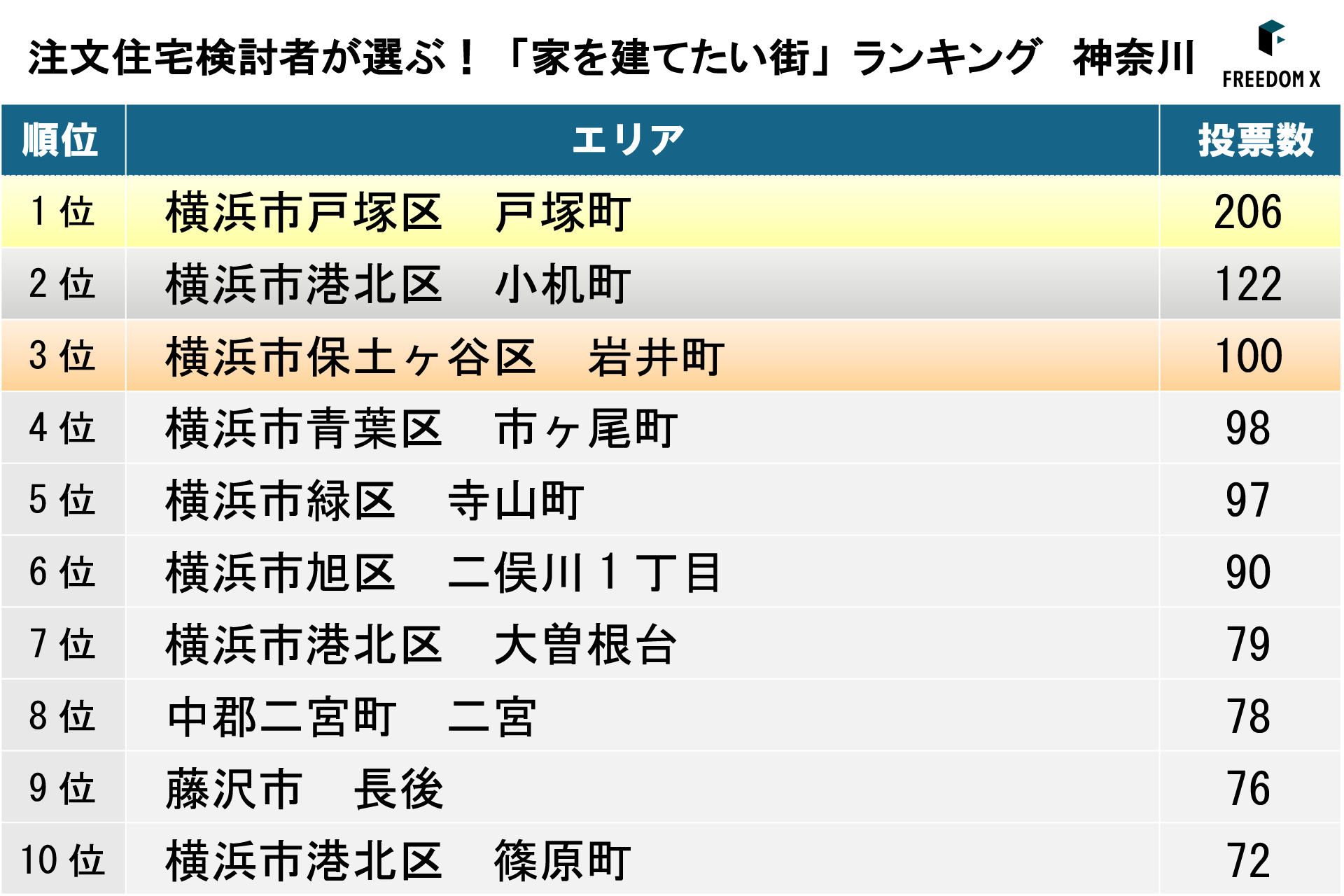 注文住宅検討者に人気の神奈川県内では、横浜市内でもこの三拍子がそろったエリアが上位にランクインしました。