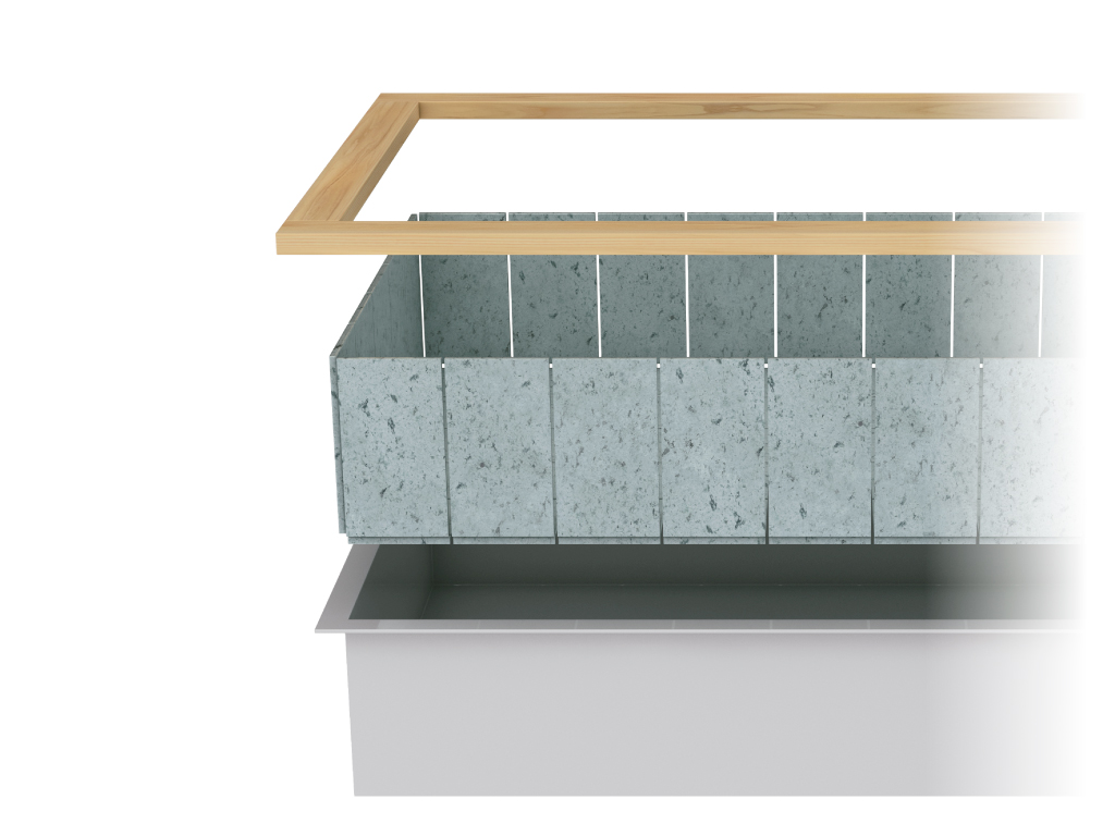 SUS製の函体(かんたい)を防水層とし、現場では石を貼って仕上げるだけで完了する設計のため、在来工法に比べて大幅な納期短縮と品質安定化を実現しています。