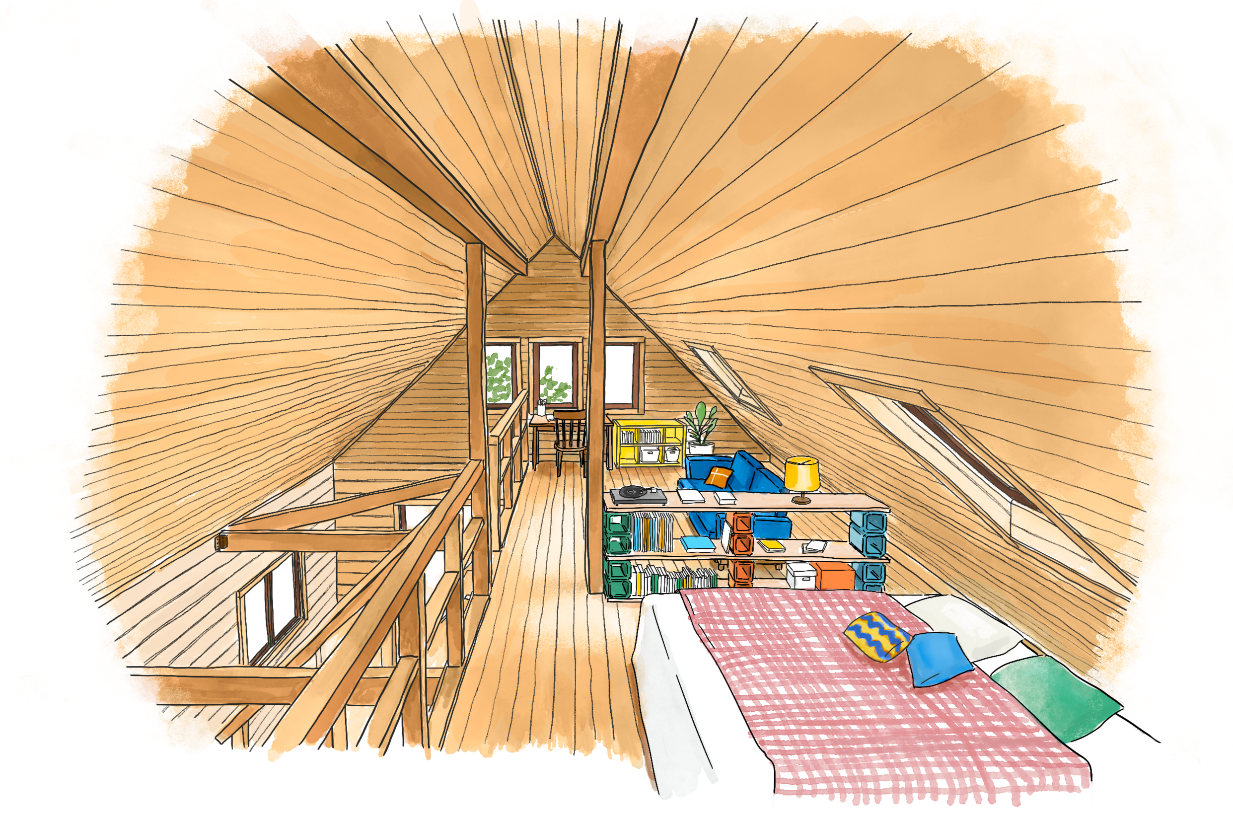 ログハウスならではの斜め天井と天窓がポイントの、秘密基地のようなロフトスペース。