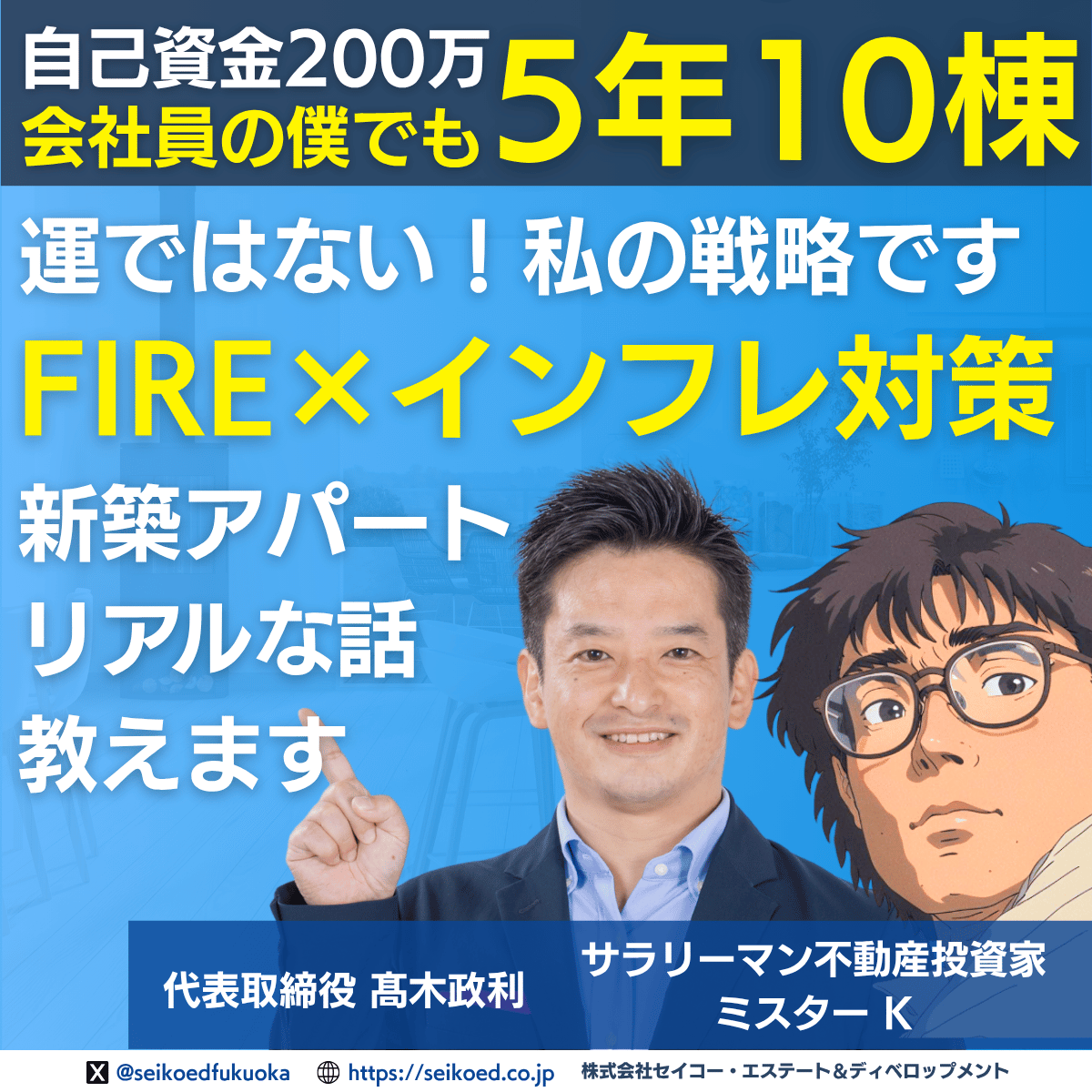 株式会社セイコー・エステート&ディベロップメント(本社:福岡市、代表取締役:高木政利)は、幻冬舎ゴールドオンラインに掲載された記事『会社員のままたった5年で10棟!“福岡の新築アパート一棟投資”が今、注目される理由とは?』で取り上げている、自己資金わずか200万円から始めてアパート15棟、融資総額約7億円を達成したサラリーマン不動産投資家ミスターK氏を講師に迎え、「40代会社員の僕でもできた。年収500万円以上のサラリーマンにおすすめの新築アパート一棟不動産投資セミナー|銀行に評価される融資戦略も全て教える」(公式サイトはコチラ)(楽待に掲載はコチラ)を2025年7月26日に開催します。不動産投資が初めての方でも最初の一棟目で失敗しないための具体的な銀行選び・物件選び・融資対策も含めて本人が実践してきた戦略を、直接学べる無料セミナーです。